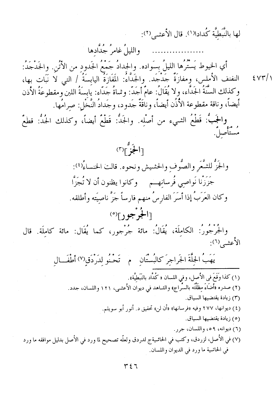أي الخيوط يسترُها الليلُ بسواده. والجدادُ جمعُ الجدود من الأتُن. والجَدْجَدُ: النفنف الأملس، ومفازةٌ جَدْجَد. والجَدَّاءُ: المفازةُ اليابسة 1/ 473 التي لا نبات بها، وكذلك السَّنَةُ الجَدَّاء، ولا يقال: عامٌ أجدّ: وشاةُ جداء: يابسة اللبن ومقطوعةُ الأذن أيضاً، وناقة مقطوعة الأذن أيضاً، وناقةٌ جدود، وجدادُ النخل: صِرامُها.