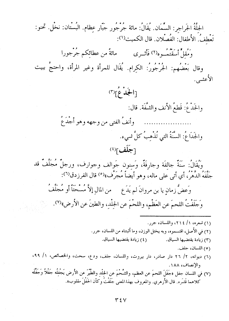 ويُقال: سنةٌ جالفة وجارفةٌ، وسنون جوالف وجوارف، ورجلٌ مجلفٌ قد جلفهُ الدهْرُ، أي أتى على ماله، وهو أ] ضاً مجرف" قال الفرزدق: