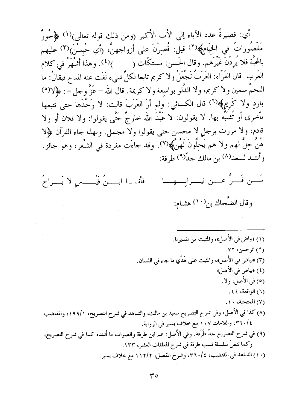 أي: قصيرة عدد الآباء إلى الأب الأكبر (ومن ذلك قوله تعالى) {حُورٌ مَقْصُورَاتٌ فِي الْخِيَامِ} قيل: قُصِرْنَ على أزواجهن، (أي حُبِسْنَ) عليهم بالمحبة فلا يُردن غيرهم. وقال الحسن: مستكات (). وهذا أشهر في كلام العرب. قال الفراء: العرب تجعلُ ولا كريم تابعاً لكل شيء نفت عنه المدح فيقالُ: ما اللحم سمين ولا كريم، ولا الدلو بواسعة ولا كريمة. قال الله - عز وجل-: {لا بَارِدٍ وَلا كَرِيمٍ} قال الكسائي: ولم أرَ العرب قالت: لا وحدها حتى تتبعها بأخرى أو تُشبه بها. لا يقولون: لا عبد الله خارج حتى يقولوا: ولا فلان أو ولا قادم، ولا مررت برجل لا محسن حتى يقولوا ولا مجمل. وبهذا جاء القرآن {لا هُنَّ حِلٌّ لَهُمْ وَلا هُمْ يَحِلُّونَ لَهُنَّ}. وقد جاءت مفردة في الشعر، وهو جائز. وأنشد لسعد بن مالك جد طرفة: