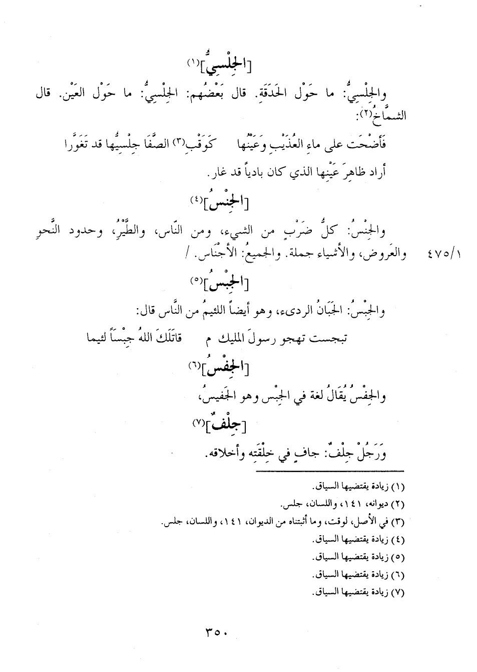 والجِنْسُ: كل ضرب من الشيء، ومن الناس، والطَّيْرُ، وحدود النحو والعروضن والأشياء جملة. والجميعُ: الأجناس. 1/ 475