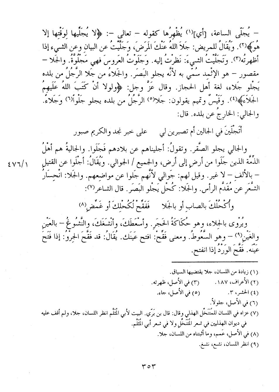 - (يجلي) الساعة، [أي] يُظهرها كقوله-تعالى-: {لا يُجَلِّيهَا لِوَقْتِهَا إِلاَّ هُوَ}. ويقال للمريض: جلا اللهُ عنكَ المرض، وجليتُ عن البيان وعن الشيء إذا أظهرتُه. وتجليتُ الشيء: نظرتُ إليه. وجلوتُ العروس فهي مجلوةُ. والجلا- مقصور- هو الإثمد سُمي به لأنه يجلو البصر. والجلاءُ من جلا الرجلُ من بلده يجلو جلاء، لغة أهل الحجاز. وقال عز وجل: {وَلَوْلا أَنْ كَتَبَ اللَّهُ عَلَيْهِمْ الْجَلاءَ}. وقيسٌ وتميم يقولون: جلا الرجل من بلده يجلو جلواً وجلاءً. والجالي: الخارج عن بلده. قال: