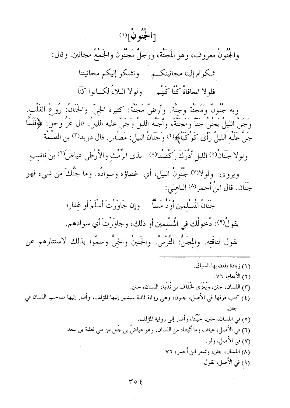 وبه جنونٌ ومَجَنَّة وجنَّة. وأرضٌ مجَنَّة: كثيرة الجِنَ. والجَنَانُ: رُوعُ القلب. وجَنَّ الليلُ يجُنُّ جناً ومَجَنَّةُ، وأجَنَّة الليلُ وجَنَّ عليه الليلُ. قال عز وجل: {فَلَمَّا جَنَّ عَلَيْهِ اللَّيْلُ رَأَى كَوْكَباً} وجنانُ الليل: مصدر. قال دريد بن الصمة: