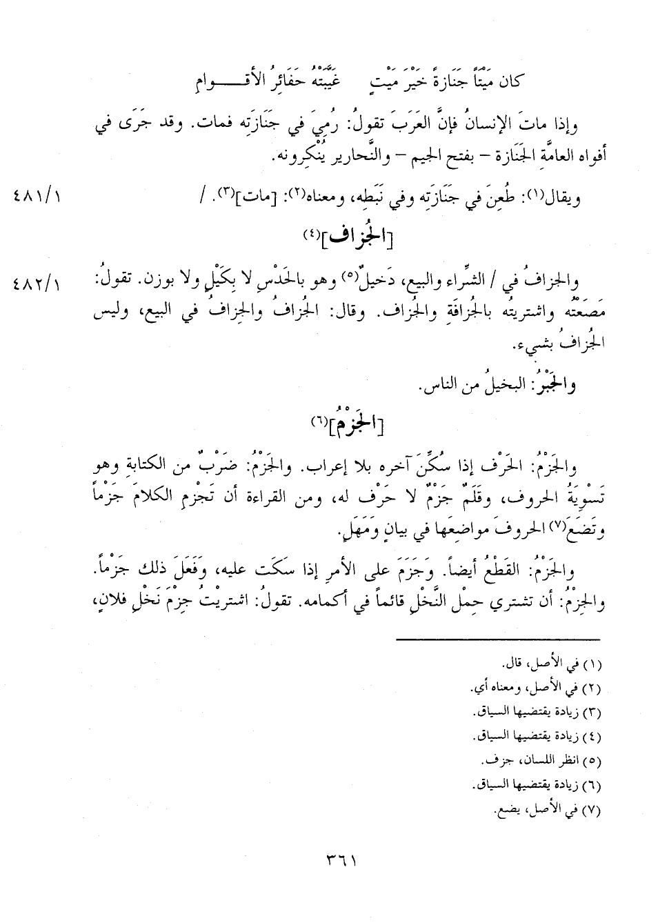 والجزاف في/ الشراء والبيع، دخيل وهو بالحدس لا بكيل ولا بوزن، تقول: مصعته واشتريته بالجزافة والجزاف، وقال: الجزاف والجزاف في البيع، وليس الجزاف بشيء.