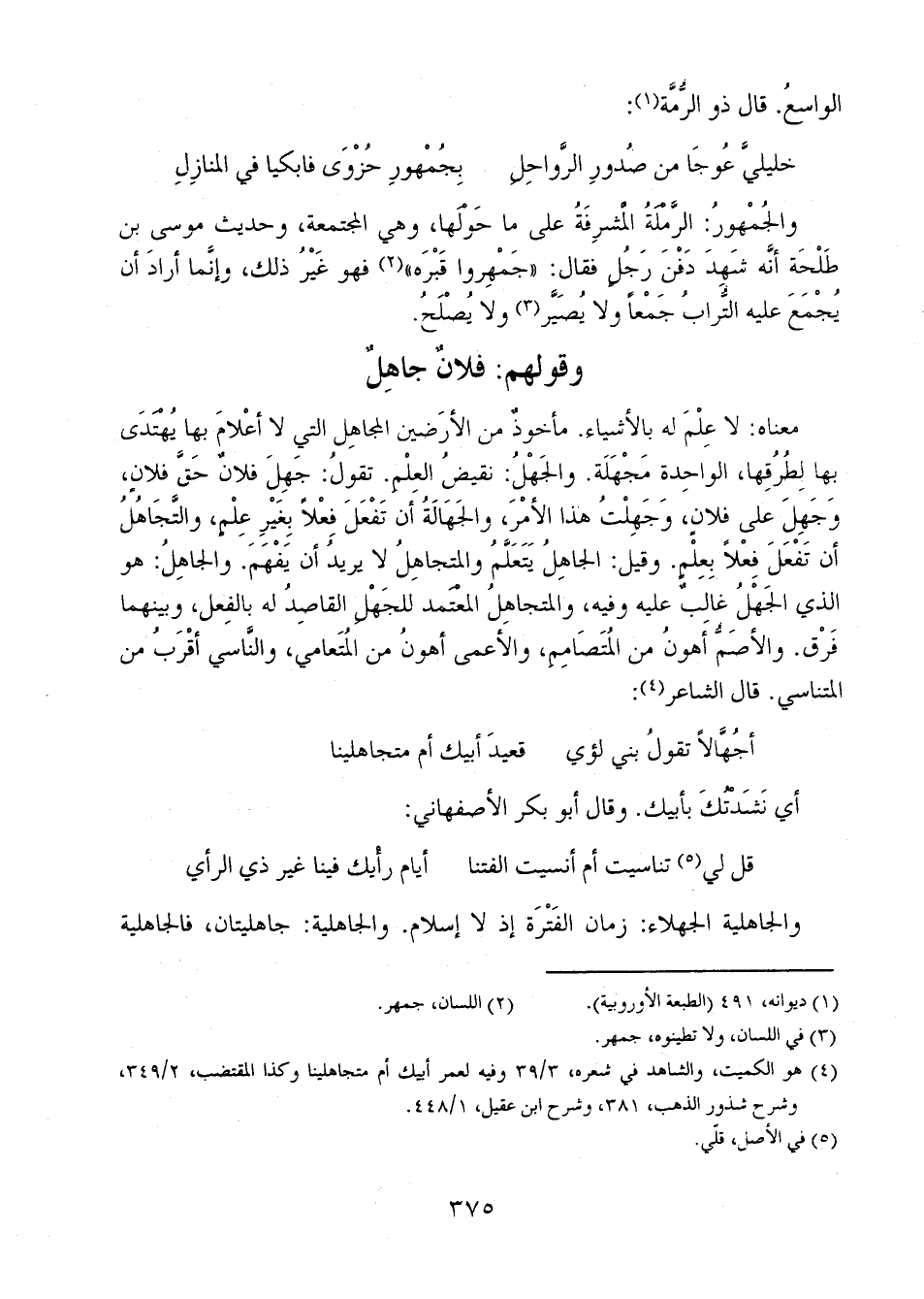 معناه: لا علم له بالأِشياء. مأخوذ من الأرضين المجاهل التي لا أعلام بها يُهتدى بها لطرقها، الواحدة مجهلة. والجهلُ: نقيضُ العلم. تقول: جهل فلانٌ حق فلان، وجهل على فلان، وجهلتُ هذا الأمر، والجهالةُ أن تفعل فعلاً بغير علم، والتجاهُل أن تفعل فعلاً بعلم. وقيل: الجاهل يتعلمُ والمتجاهلُ لا يريد أن يفهم. والجاهل: هو الذي الجهلُ غالبٌ عليه وفيه، والمتجاهل المعتمد للجهل القاصد له بالفعل، وبينهما فرق. والأصم أهون من المتصامم، والأعمى أهون من المتعامي، والناسي أقرب من المتناسي. قال الشاعر: