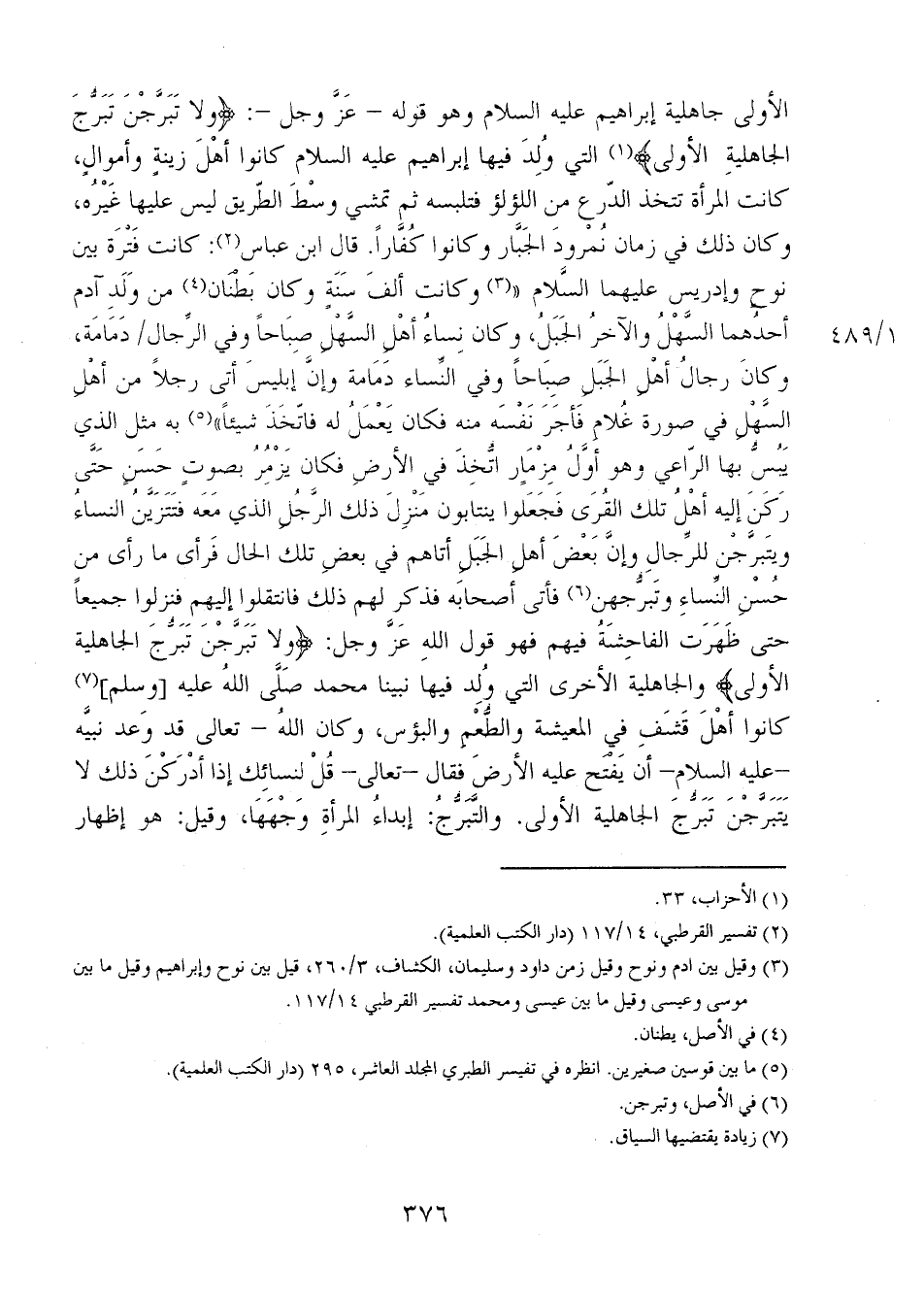 الأولى جاهلية إبراهيم عليه السلام وهو قوله- عز وجل-: {وَلا تَبَرَّجْنَ تَبَرُّجَ الْجَاهِلِيَّةِ الأُولَى} التي وُلِدَ فيها إبراهيم عليه السلام كانوا أهل زينة وأموال، كانت المرأة تتخذ الدرع من اللؤلؤ فتلبسه ثم تمشي وسط الطريق ليس عليها غيره، وكان ذلك في زمان نمرود الجبار وكانوا كفاراً. قال ابن عباس: كانت فترة بين نوح وإدريس عليهما السلام "وكانت ألف سنة وكان بطنان من ولد آدم أحدهما السهلُ والآخر الجبلُ، وكان نساء أهل السهل صباحاً وفي الرجال 1/ 489 دمامةُ، وكان رجال أهل الجبل صباحاً وفي النساء دمامة وإن إبليس أتى رجلاً من أهل السهل في صورة غلام فأجر نفسه منه فكان يعمل له فاتخذ شيئاً" به مثل الذي يبس بها الراعي وهو أول مزمار اتخذ في الأرض فكان يزمر بصوت حسن حتى ركن إليه أهل تلك القرى فجعلوا ينتاوبون منزل ذلك الرجل الذي معه فتتزين النساء ويتبرجن للرجال وإن بعض أهل الجبل أتاهم في بعض تلك الحال فرأى ما رأى من حسن النساء وتبرجهن فأتى أصحابه فذكر لهم ذلك فانتقلوا إليه فنزلوا جميعاً حتى ظهرت الفاحشة فيهم فهو قول الله عز وجل: {وَلا تَبَرَّجْنَ تَبَرُّجَ الْجَاهِلِيَّةِ الأُولَى} والجاهلية الأخرى التي وُلِد فيها نبينا محمد صلى الله عليه [وسلم] كانوا أهل قشف في المعيشة والطعم والبؤس، وكان الله - تعالى قد وعد نبيه - عليه السلام - أن يفتح عليه الأرض فقال- تعالى- قل لنسائك إذا أدركن ذلك لا يتبرجن تبرج الجاهلية الأولى. والتبرجُ: إبداء المرأة وجهها، وقيل: هو إظهار