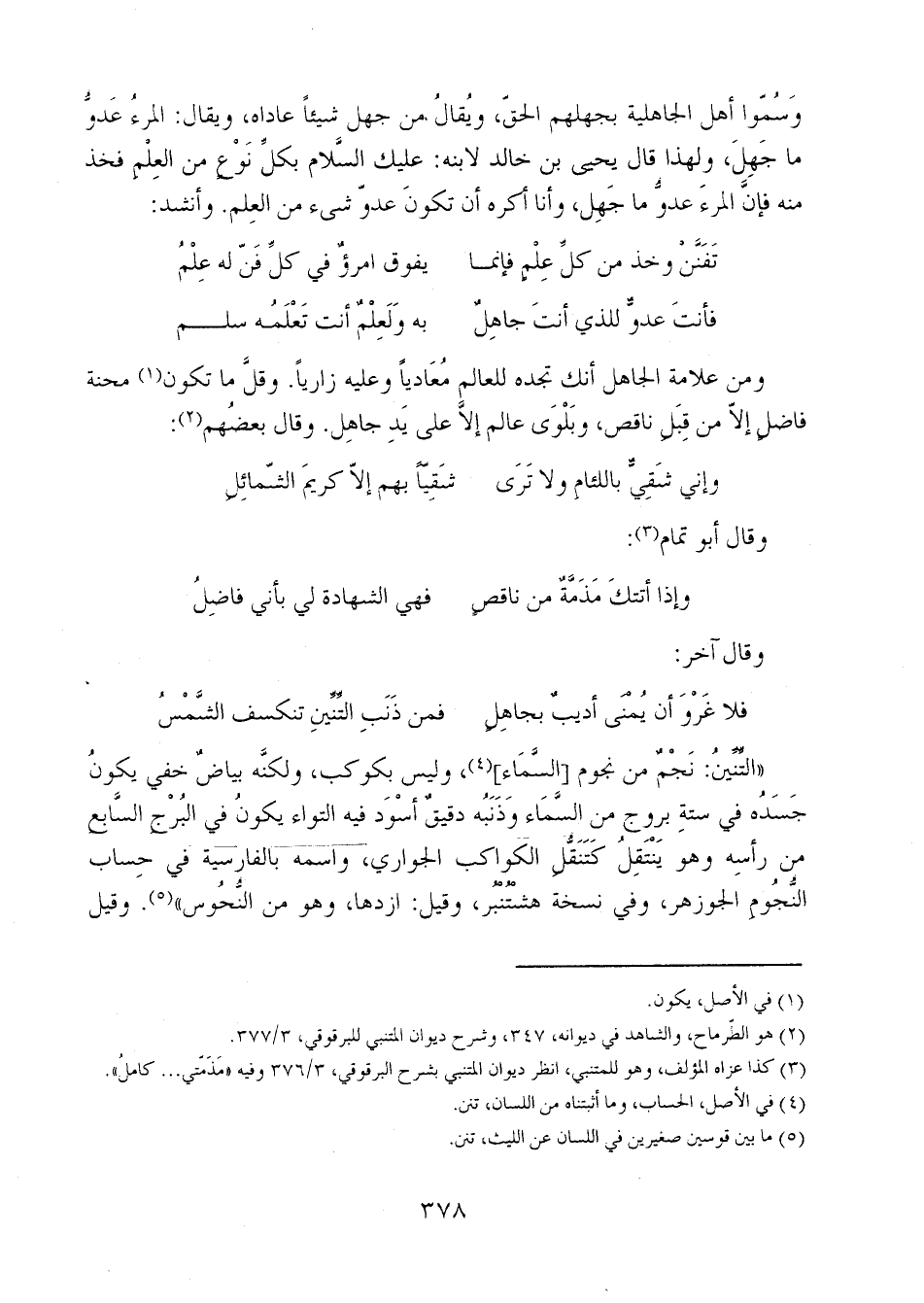 وسموا أهل الجاهلية بجهلههم الحق، ويقال من جهل شيئاً عاداه، ويقال: المرء عدو ما جهل، ولهذا قال يحيى بن خالد لابنه: عليك السلام بكل نوع من العلم فخذ منه فإن المرء عدو ما جهل، وأنا أكره أن تكون عدو شيء من العلم. وأنشد: