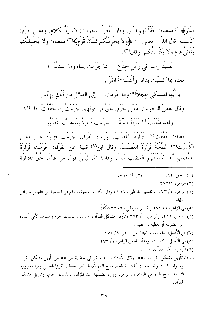 النَّارَ} فمعناه: حقاً لهم النار. وقال بعض النحويين: لا، ردٌّ لكلام، ومعنى جرم: كسبَ. قال الله- تعالى-: {وَلا يَجْرِمَنَّكُمْ شَنَآنُ قَوْمٍ} فمعناه: ولا يحملنكم بُغضُ قومٍ ولا يكسبنكم. وقال: