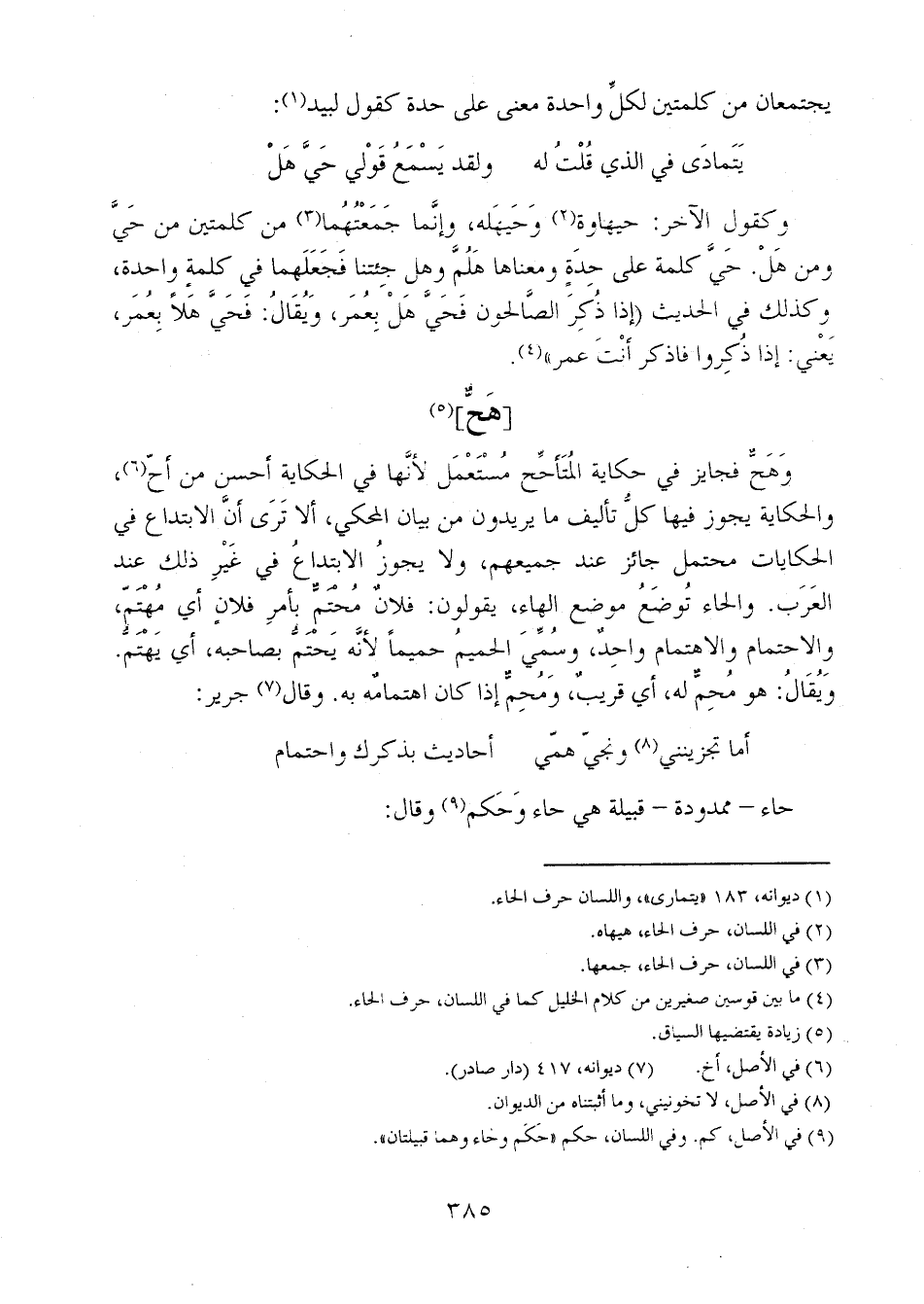 وهحٍّ فجايز في حكاية المتأحِّح مستعمل لأنها في الحكاية أحسن من أحّ، والحكاية يجوز فيها كل تأليف ما يريدون من بيان المحكي، ألا ترى أن الابتداع في الحكايات محتمل جائز عند جميعهم، ولا يجوز الابتداعُ في غير ذلك عندالعرب. والحاء توضع موضع الهاء، يقولون: فلانٌ محتم بأمر فلان أي مهتمّ، والاحتمام والاهتمام واحدٌ، وسُمي الحميم حميماً لأنه يحتم بصاحبه، أي يهتم. ويقال: هو محمٌّ له، أي قريب، ومحِمٌّ إذا كان اهتمامه به. وقال جرير: