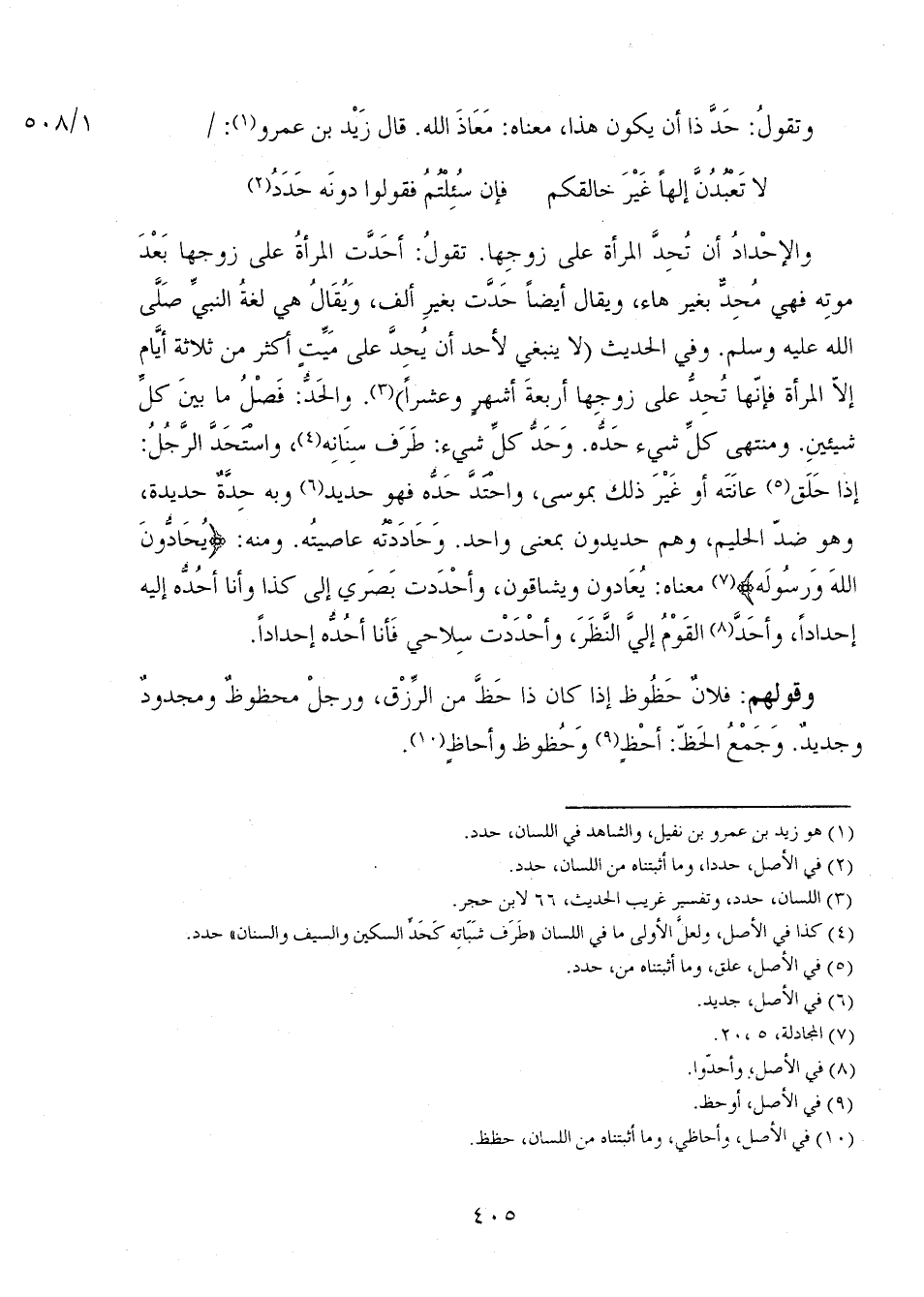 وتقول: حدُّ ذا أن يكون هذا، معناه: معاذ الله. قال زيد بن عمرو: 1/ 508