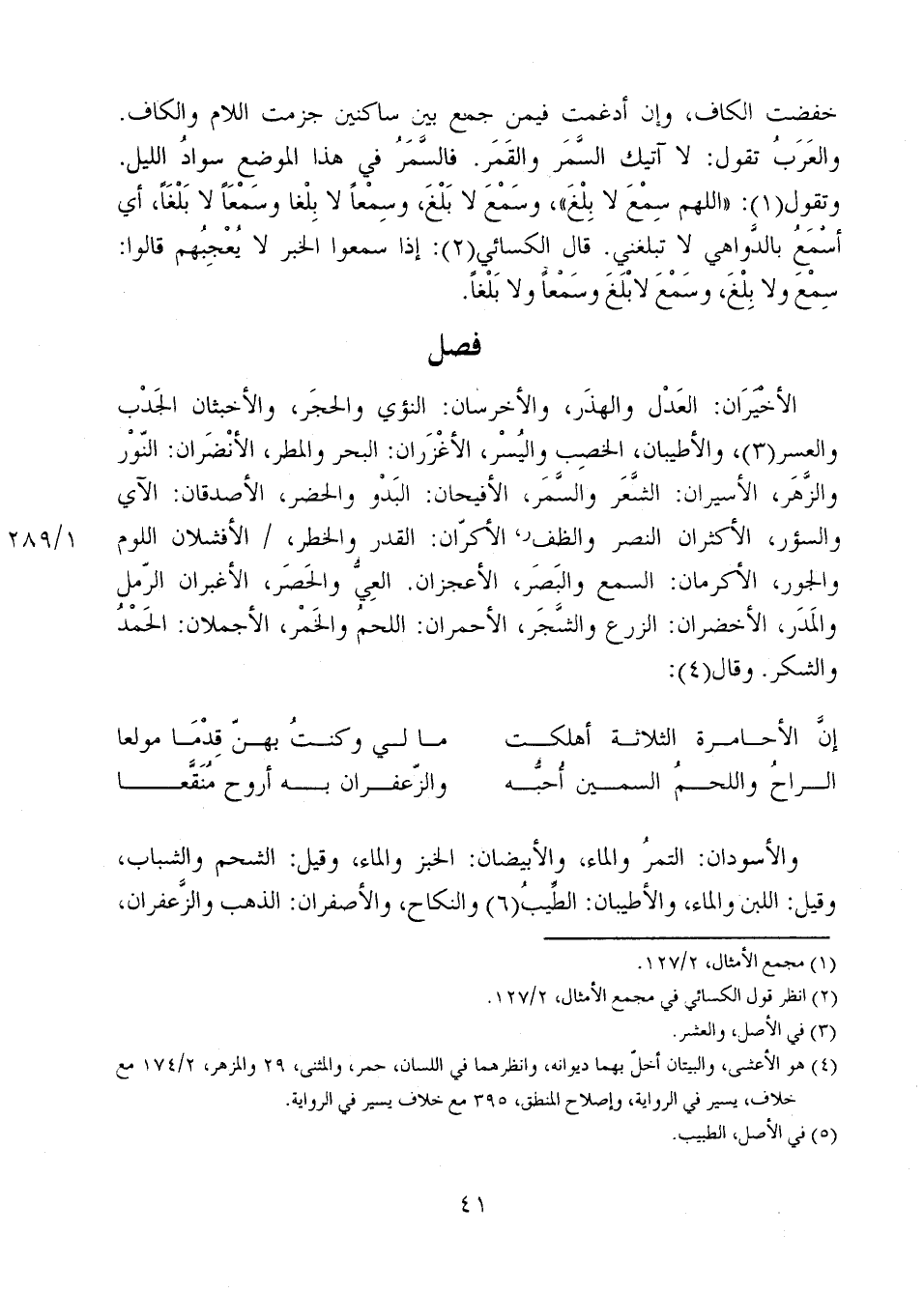 الأخيران: العدْل والهذَر، والأخرسان: النؤي والحجر، والأخبثان الجَدْب والعسر، والأطيبان، الخصب واليُسْر، الأغْزَران: البحر والمطر، الأنضران: النّوْر والزَّهَر، الأسيران: الشعر والسَّمَر، الأفيحان: البدو والحضر، الأصدقان: الآي والسؤر، الأكثران النصر والظفر، الأكران: القدر والخطر، 1/ 289 الأفشلان اللوم والجور، الأكرمان: السمع والبصر، الأعجزان. العِيُّ والحصر، الأغبران الرمل والمدر، الأخضران: الزرع والشجر، الأحمران: اللحمُ والخمْر، الأجملان: الحمدُ والشكر. وقال: