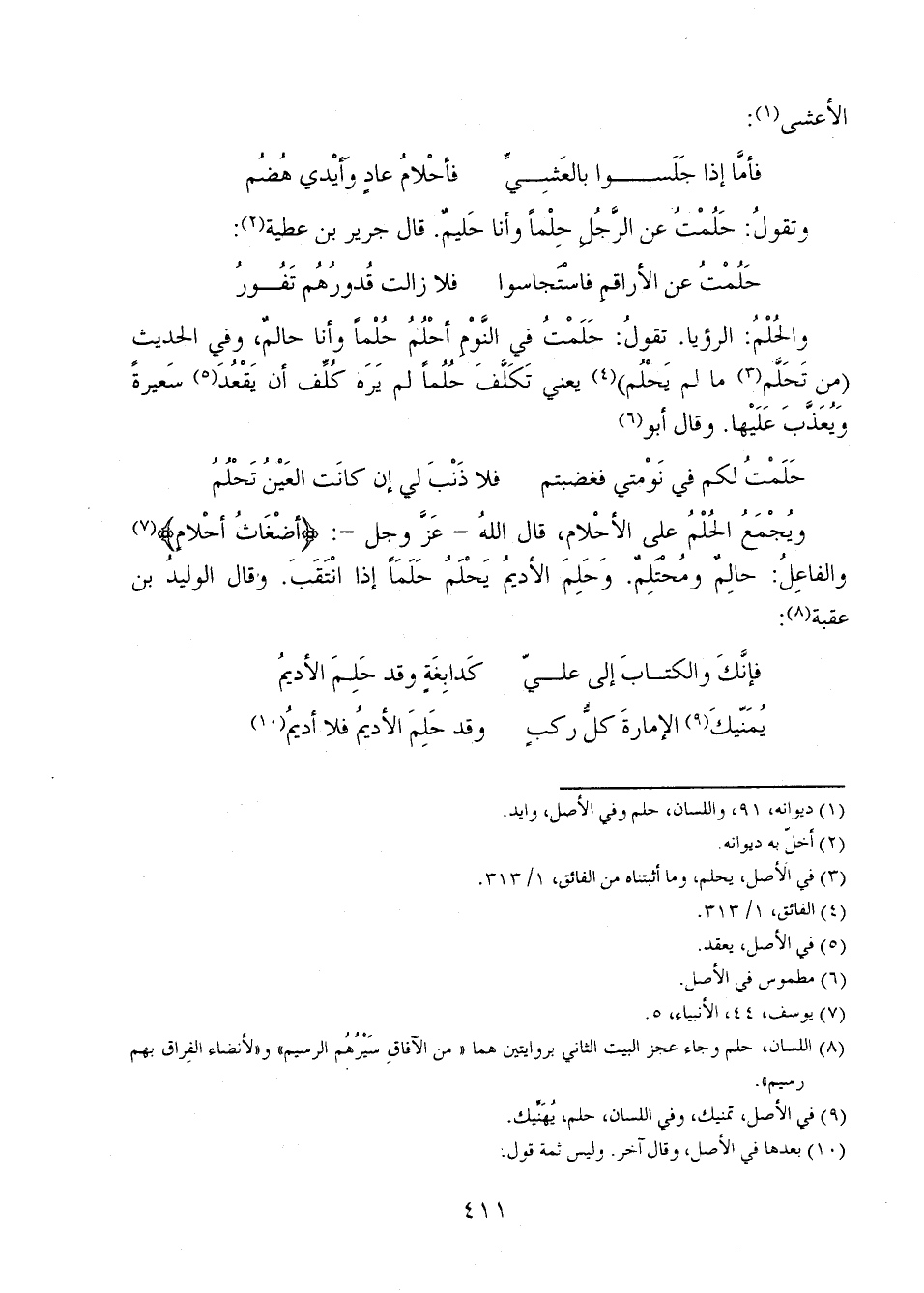 ويجمعُ الحُلْمُ على الأحلام، قال الله - عز وجل-: {أَضْغَاثُ أَحْلامٍ} والفاعلُ: حالِمٌ ومُحْتَلِمٌ. وحَلِمَ الأديمُ يَحْلَمُ حَلَمَاً إذا انتَقَبَ. وقال الوليدُ بن عقبة: