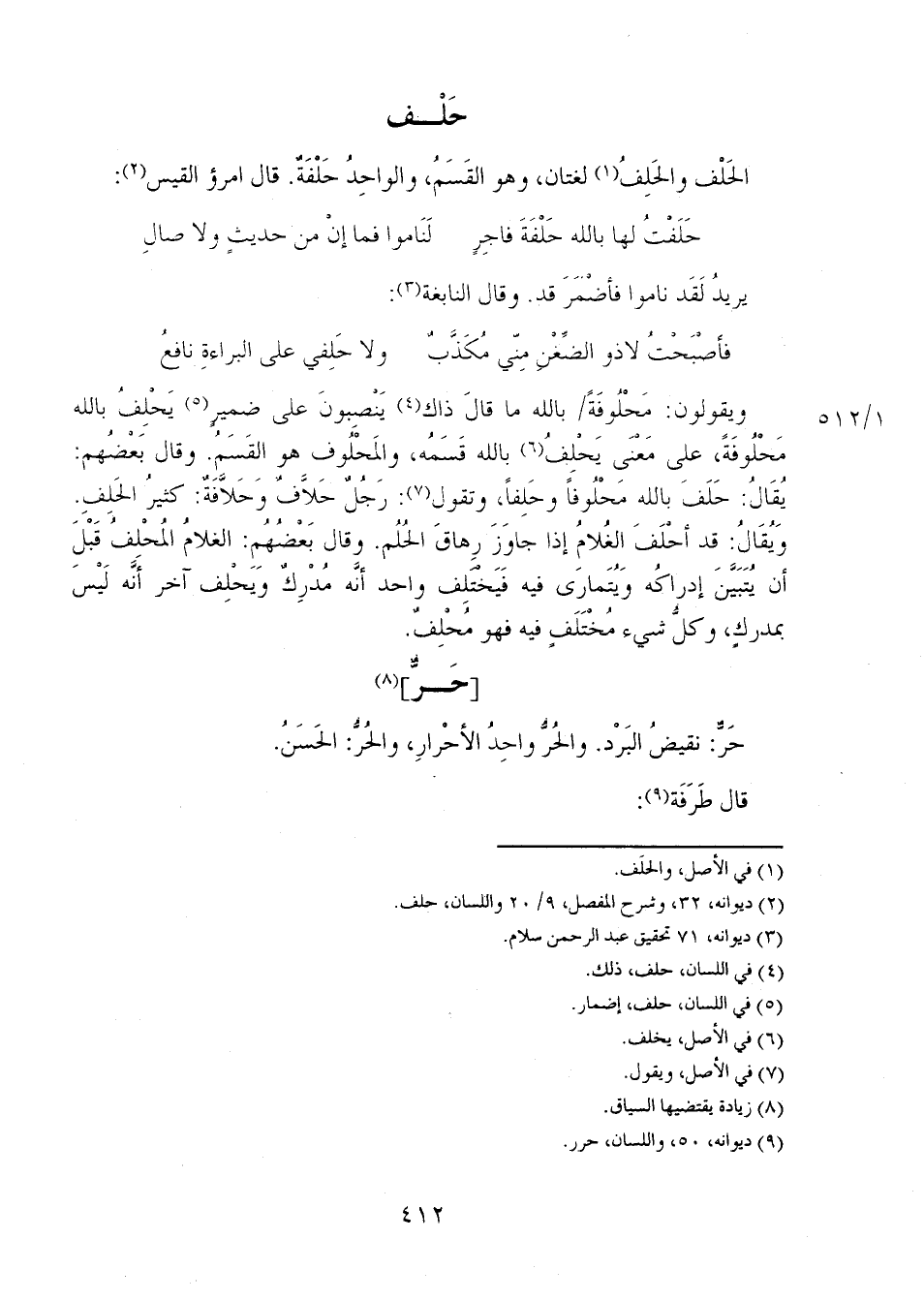 ويقولون: محلوفةً 1/ 512 بالله ما قال ذاك ينصبون على ضمير يحلف بالله محلوفةً، على معنى يحلفُ بالله قسمه، والمحلوف هو القسم. وقال بعضهم: يقال: حلَفَ بالله محلوفاً وحلفاً، وتقول: رجلٌ حلافٌ وحلافةٌ: كثيرُ الحلف. ويقال: قد أحلفَ الغلام إذا جاوز رهاق الحُلُم. وقال بعضهم: الغلامُ المحلفُ قبلَ أن يتبين إدراكه ويتمارى فيه فيختلف واحد أنه مُدركٌ ويحلف آخر أنه ليس بمدرك، وكل شيء مختلفٍ فيه فهو مُحِلْفٌ.
