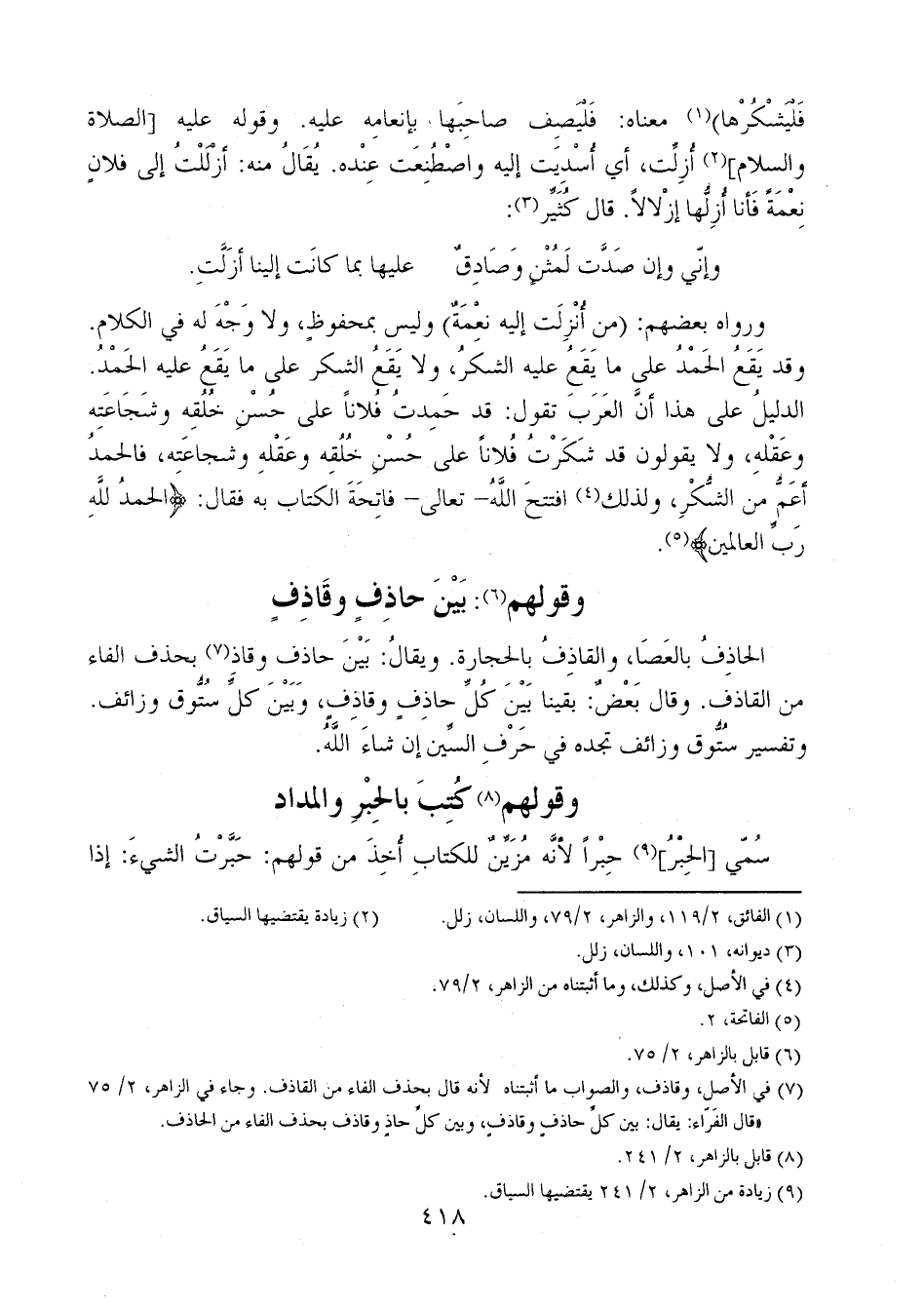 الحاذفُ بالعصا، والقاذف بالحجارة. ويقال: بين حاذف وقاذ بحذف الفاء من القاذف. وقال بعضٌ: بقينا بين كل حاذف وقاذف، وبين كل ستوف وزائف. وتفسير ستوق وزائف تجده في حرف السين إن شاء الله.