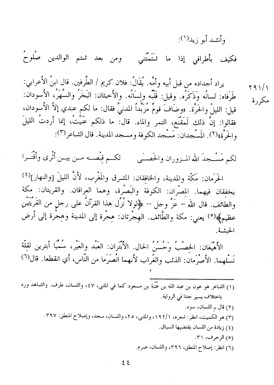 يراد أجداده من قبل أبيه وأمه. يقال: فلان كريم 1/ 291 الطرفين. قال ابن الأعرابي: طرفاه: لسانه وذكره. وقيل: قلبه ولسانه. والأخبثان: البخرُ والسهر، الأسودان: قيل: الليل والحرة. "وضاف قوم مزبداً المدني فقال: ما لكم عندي إلا الأسودان، فقالوا: إن ذلك لمقنع، التمر والماء. قال: ما ذلكم عنيت، إنما أردت الليل والحرة". المسجدان: مسجد الكوفة ومسجد المدينة. قال الشاعر: