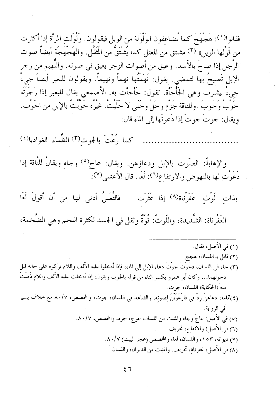 فقالوا: هجهج كما يُضاعفون الولولة من الويل فيقولون: وَلْوَلتِ المرأة إذا أكثرت من قولها الويل" مشتق من المعتل كما يُشتق من المُقل. والهَجْهَجَة أيضاً صوت الرجل إذا صاح بالأسد. وعيق من أصوات الزجر يعيق في صوته. والنهيم من زجر الإبل تصيحُ بها لتمضي. يقول: نَهَمْتُها نهماً ونهيماً. ويقولون للبعير أيضاً جيء جيءْ ليشرب وهي الجَاجَأة. تقول: جأجأت به. الأصمعي يقال للبعير إذا زجرته حَوْبُ وحَوبَ. وللناقة جَزْم وحَلْ وحَلَى لا حَلَيْتُ. غيْرُه حَوَّيْتُ بالإبل من الحَوْب. ويقال: جوتَ جوتَ إذا دَعوتَها إلى الماء قال: