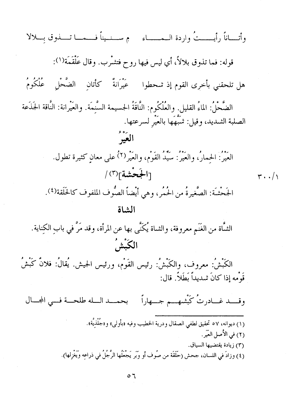 الضحل: الماء القليل. والعلكوم. الناقة الجسيمة السنمة. والعيرانة: الناقة الجذعة الصلبة الشديد، وقيل: شبهها بالعير لسرعتها.