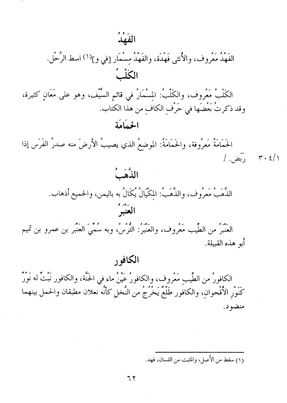 الفهد معروف، والأنثى فهدة، والفهد مسمار [في و] اسط الرحل.