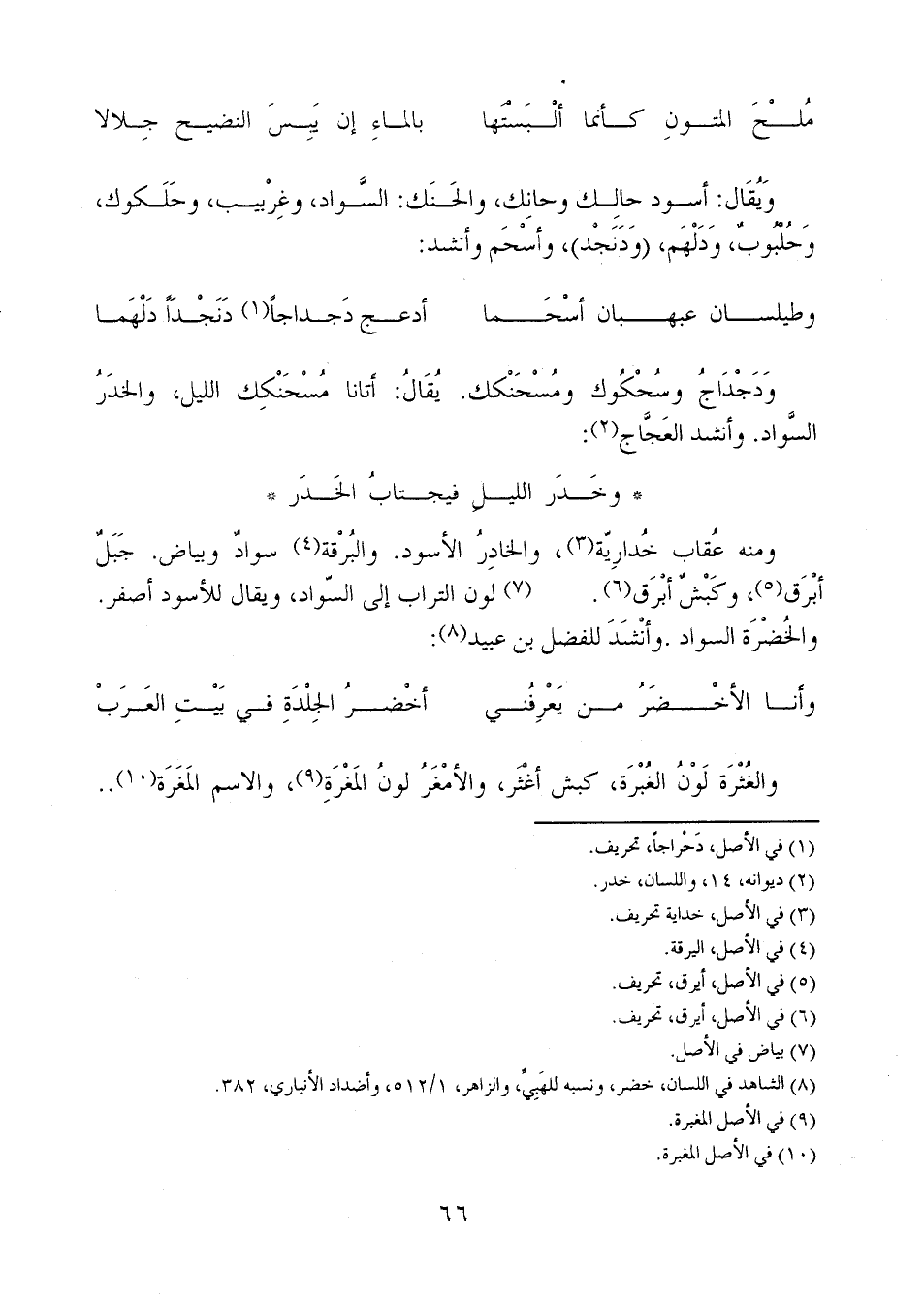 ومنه عُقاب خُدارية، والخادِرُ الأسود. والبُرْقة سوادٌ وبياض. جبلٌ أبرق، وكبشٌ أبرق. لون التراب إلى السواد، ويقال للأسود أصفر. والخُضْرَة السواد. وأنشد للفضل بن عبيد:
