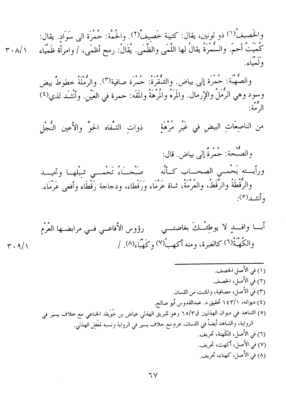 والخصيف ذو لونين، يقال: كتيبة خصيفٌ. والحُمِّة: حُمَّرَةِ إلى سوادٍ. يقال: كُميتُ أحم. والسُّمْرَةُ يقالُ لها اللمى والظمي. يُقال: رمح أظمى، 1/ 308 وامرأة ظمياء ولمياء.