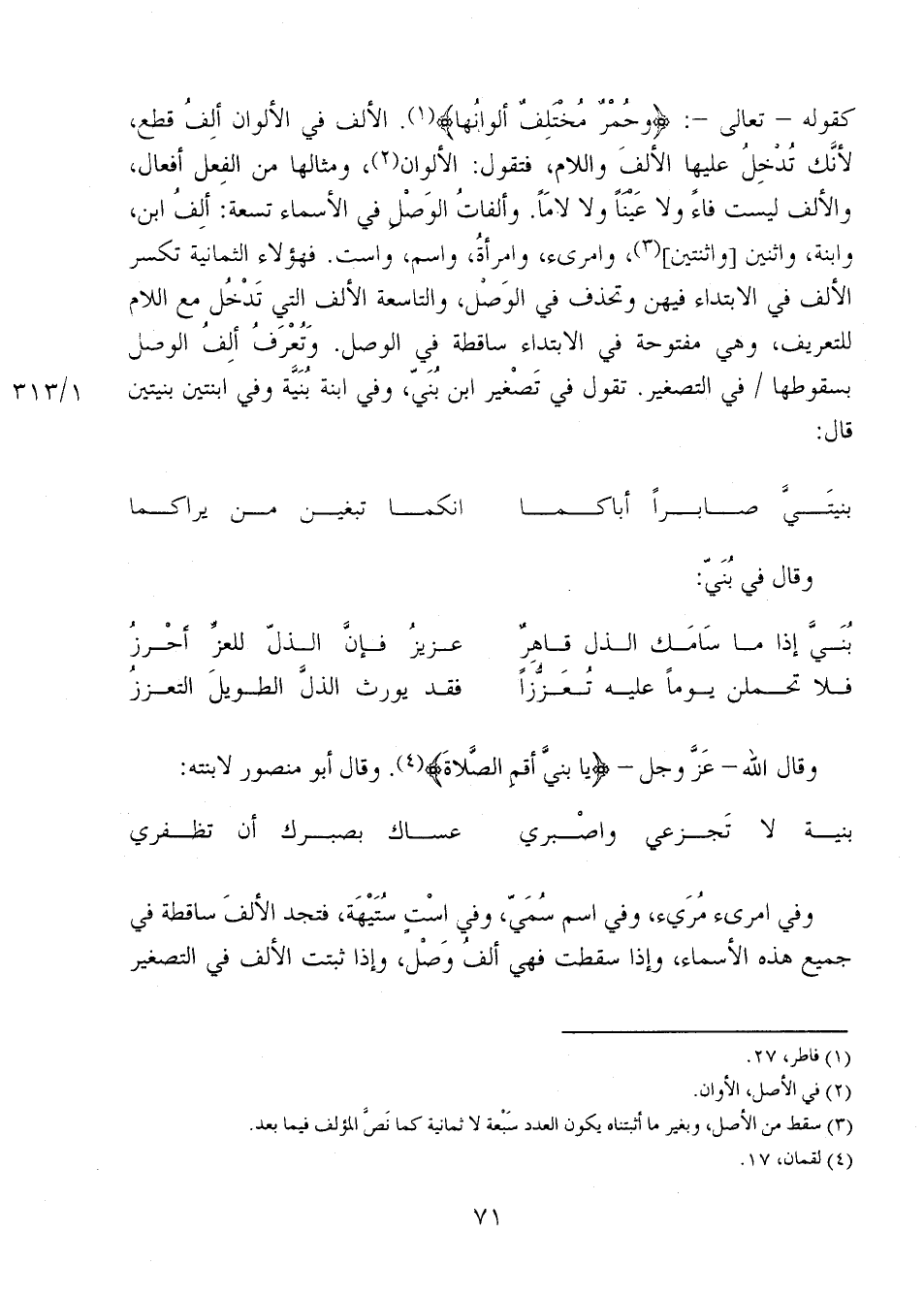 كقوله- تعالى-: {وَحُمْرٌ مُخْتَلِفٌ أَلْوَانُهَا}. الألف في الألوان ألفُ قطع، لأنك تُدخلُ عليها الألف واللام، فتقول: الألوان، ومثالها من الفعل أفعال، والألف ليست فاء ولا عيناً ولا لاماً. وألفاتُ الوصل في الأسماء تسعة: ألفُ ابن، وابنة، واثنين [واثنتين]، وامريء، وامرأة، واسم، واست. فهؤلاء الثمانية تكسر الألف في الابتداء فيهن وتحذف في الوصل، والتاسعة الألف التي تدخل مع اللام للتعريف، وهي مفتوحة في الابتداء ساقطة في الوصل. وتُعْرَفُ ألفُ الوصل بسقوطها 1/ 313 في التصغير. تقول في تصغير ابن بُنَيّ، وفي ابنة بُنَيَّة وفي ابنتين بنيتين قال: