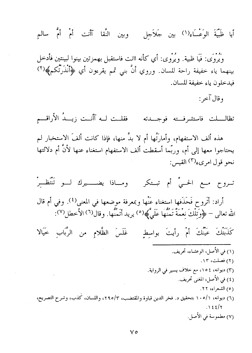 ويُرْوَى: فيا ظبية. ويُروى: أي كأنه أأنت فاستقبل بهمزتين بينوا لبينتين فأدخل بينهما ياء خفيفة راحة للسان. وروي أن بني تمم يقرءون أي {أَنذَرْتُكُمْ} فيدخلون ياء خفيفة للسان.