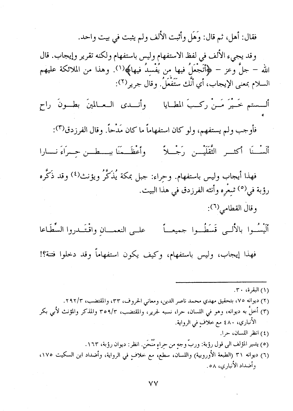 وقد يجيء الألف في لفظ الاستفهام وليس باستفهام ولكنه تقرير وإيجاب. قال الله - جل وعز- {أَتَجْعَلُ فِيهَا مَنْ يُفْسِدُ فِيهَا}. وهذا من الملائكة عليهم السلام بمعنى الإيجاب، أي أنك ستفعل. وقال جرير:
