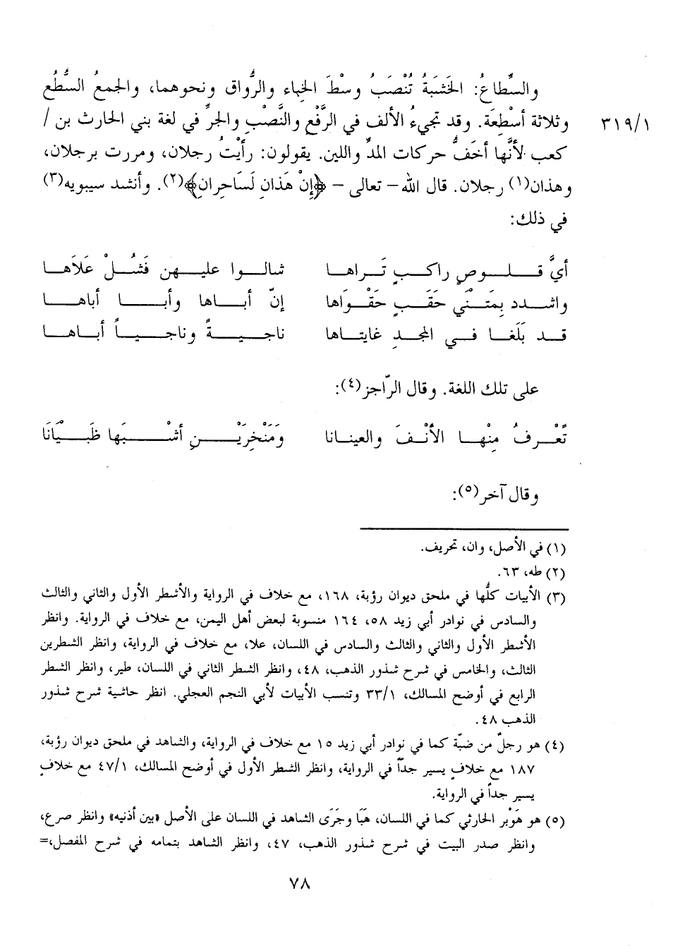 والسطاعُ: الخشبة تُنصبُ وسط الخباء والرُّواق ونحوهما، والجمعُ السطُع وثلاثة أسطعة. وقد تجيء الألف في الرفع والنصب والجر في لغة بني الحارث بن 1/ 319 كعب لأنها أخف حركات المد واللين. يقولون: رأيتُ رجلان، ومررت برجلان، وهذان رجلان. قال الله - تعالى- {إِنْ هَذَانِ لَسَاحِرَانِ}. وأنشد سيبويه في ذلك: