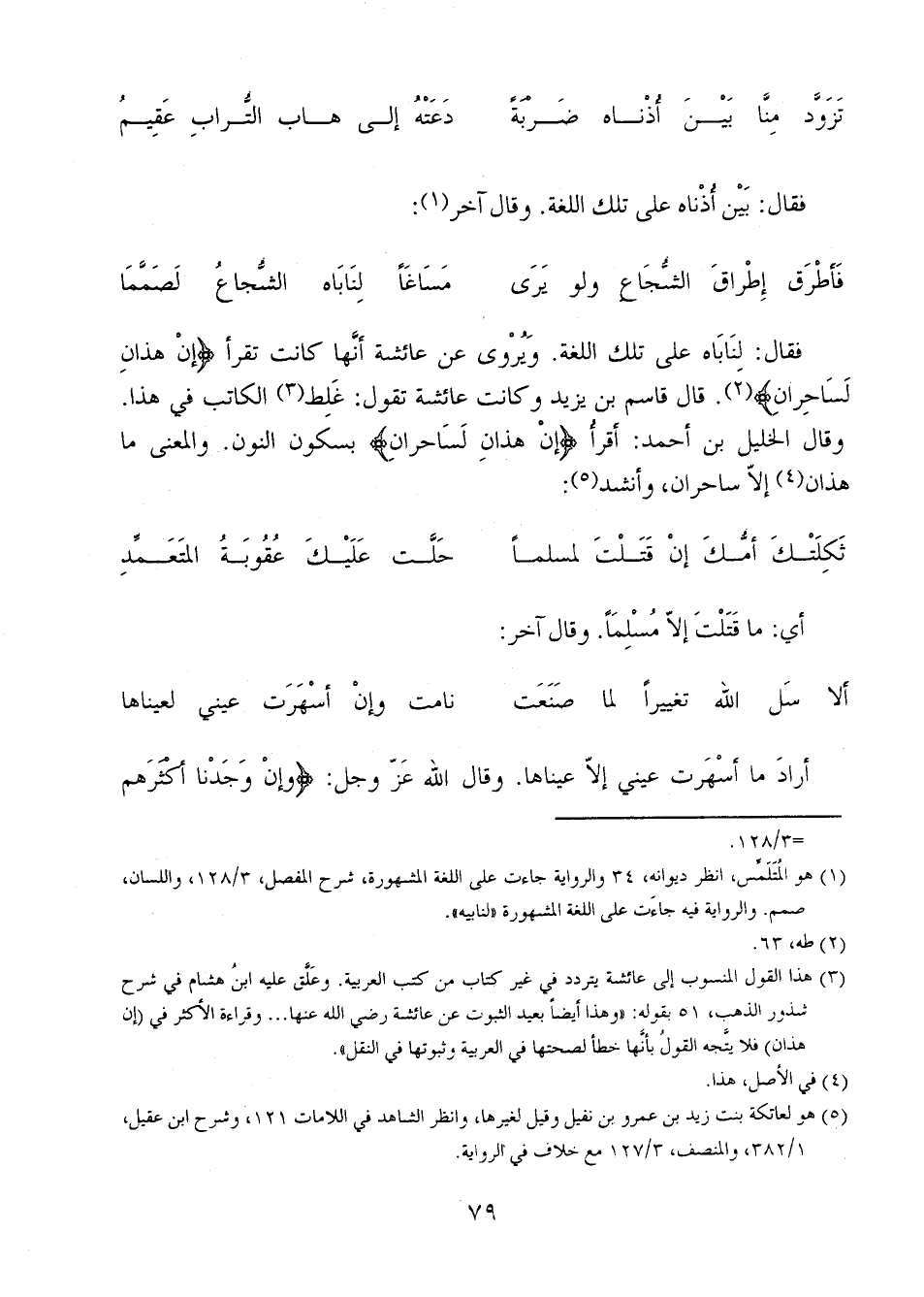 فقال: لناباه على تلك اللغة. ويروى عن عائشة أنها كانت تقرأ {إِنْ هَذَانِ لَسَاحِرَانِ}. قال قاسم بن يزيد وكانت عائشة تقول: غلط الكاتب في هذا. وقال الخيل بن أحمد: اقرأ {إِنْ هَذَانِ لَسَاحِرَانِ} بسكون النون. والمعنى ما هذان إلا ساحران، وأنشد: