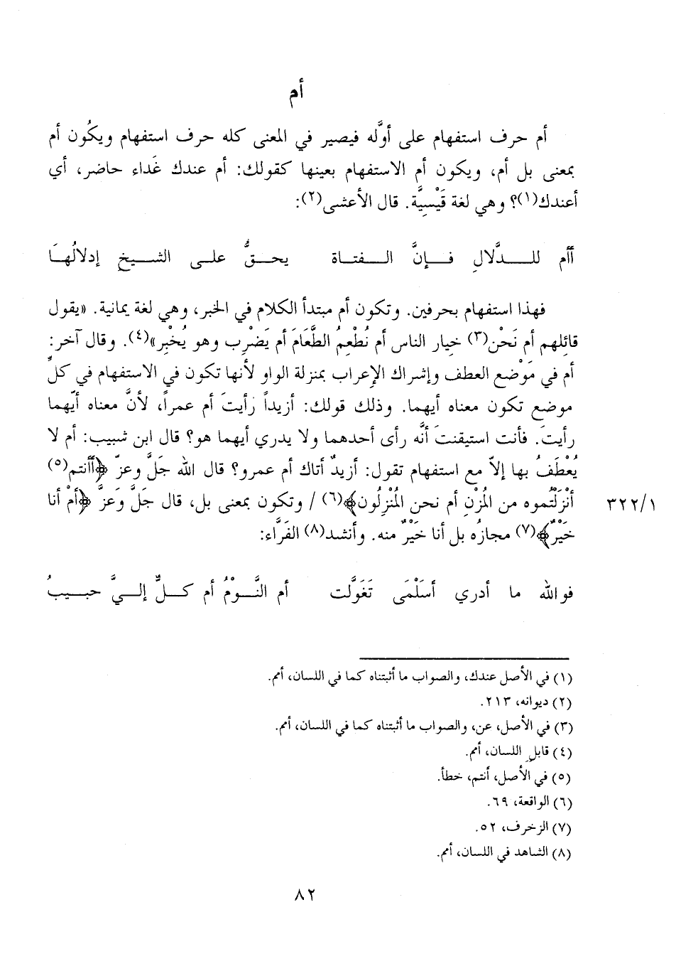 فهذا استفهام بحرفين. وتكون أم مبتدأ الكلام في الخبر، وهي لغة يمانية. "يقول قائلهم أم نحن خيار الناس أم نطعم الطعام أم يضرب وهو يخبر". وقال آخر: أم في موضع العطف وإشراك الإعراب بمنزلة الواو لأنها تكون في الاستفهام في كل موضع تكون معناه أيهما. وذلك قولك: أزيداً رأيت أم عمراً، لأن معناه أيهما رأيت. فأنت استيقنت أنه رأي أحدهما ولا يدري أيهما هو؟ قال ابن شبيب: أم لا يعطفُ بها إلا مع استفهام تقول: أزيدٌ أتاك أم عمرو؟ قال الله جل وعز {أَأَنْتُمْ أَنزَلْتُمُوهُ مِنْ الْمُزْنِ أَمْ نَحْنُ الْمُنزِلُونَ} 1/ 322 وتكون بمعنى بل، قال جل وعز {أَمْ أَنَا خَيْرٌ} مجازُه بل أنا خيرٌ منه. وأنشد الفراء: