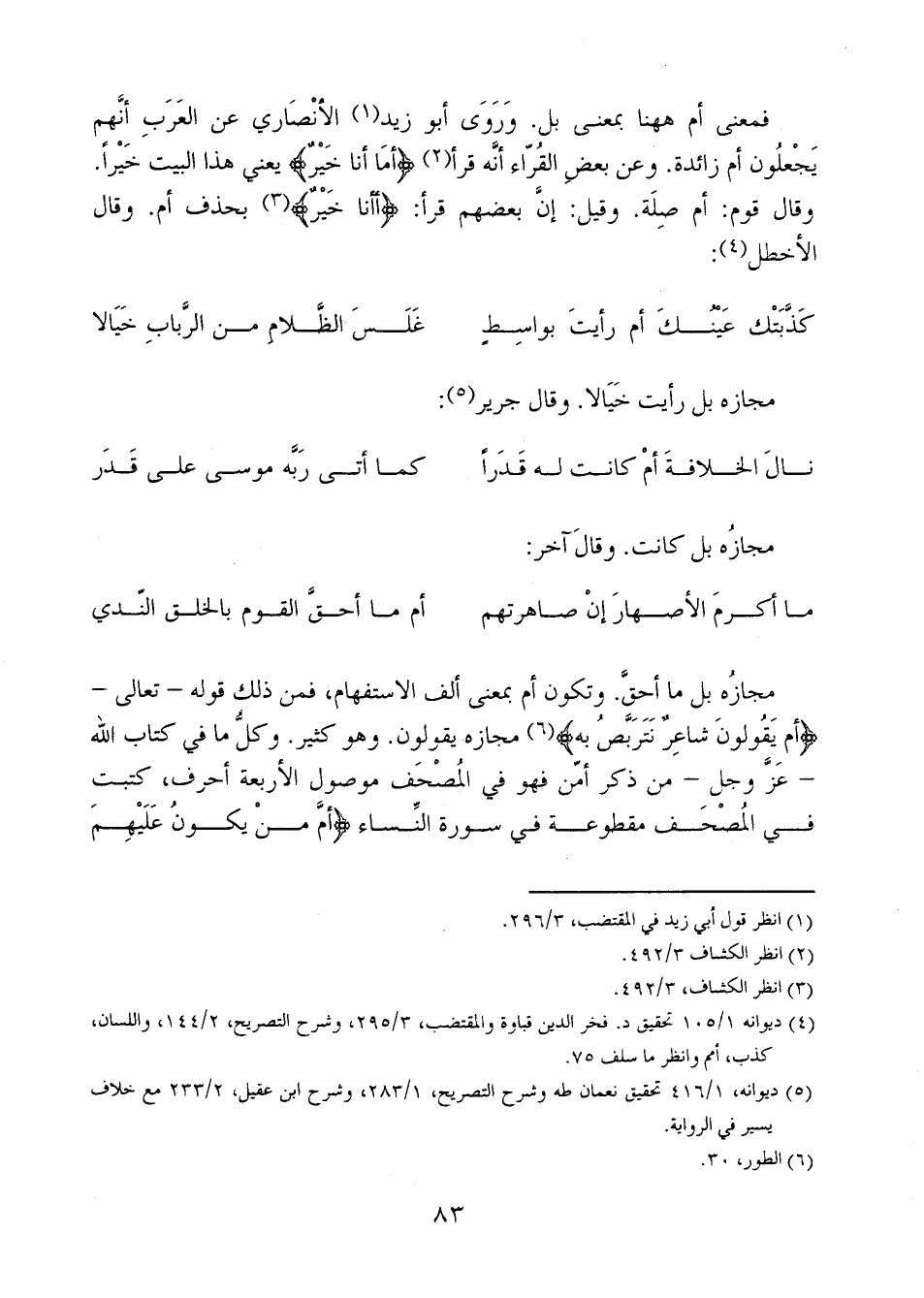 مجازه بل ما أحق. وتكون أم بمعنى ألف الاستفهام، فمن ذلك قوله - تعالى- {أَمْ يَقُولُونَ شَاعِرٌ نَتَرَبَّصُ بِهِ} مجازه يقولون. وهو كثير. وكل ما في كتاب الله - عز وجل - من ذكر أمن فهو في المصحف موصول الأربعة أحرف، كتبت في المصحف مقطوعة في سورة النساء {أَمْ مَنْ يَكُونُ عَلَيْهِمْ