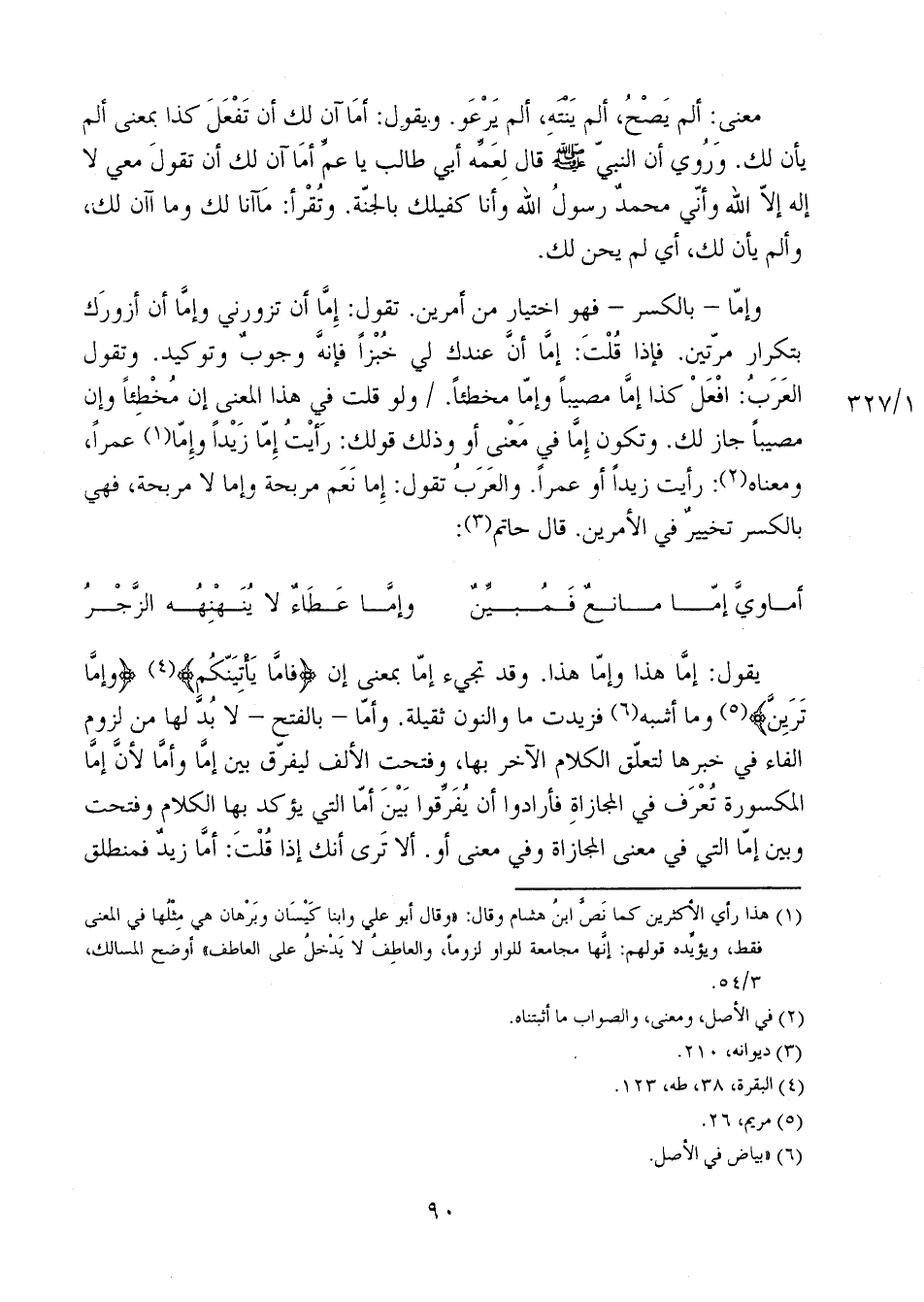 وإمَّا - بالكسر - فهو اختيار من أمرين. تقول: إمَّا أن تزورني وإمَّا أن أزورك بتكرار مرتين. فإذا قُلت: إمَّا أن عندك لي خُبزاً فإنه وجوب وتوكيد. وتقول العرب: افعلْ كذا إما مصيباً وإما مخطئاً. 1/ 327 ولو قلت في هذا المعنى إن مخطئاً وإن مصيباً جاز لك. وتكون إما في معنى أو وذلك قولك: رأيتُ إما زيداً وإما عمراً، ومعناه: رأيت زيداً أو عمراً. والعربُ تقول: إما نعم مربحة وإما لا مربحة، فهي بالكسر تخييرٌ في الأمرين. قال حاتم: