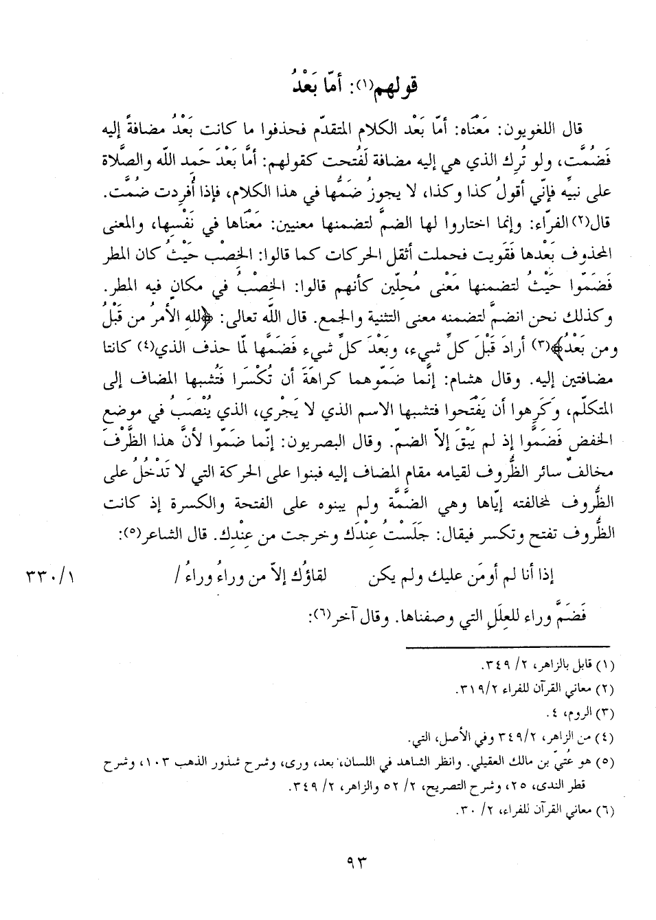 قال اللغويون: معناه: أمّا بَعْد الكلام المتقدم فحذفوا ما كانت بَعْدُ مضافةً إليه فضُمَّت، ولو تُرك الذي هي إليه مضافة لفُتحت كقولهم: أمَّا بَعْدَ حمد الله والصلاة على نبيه فإني أقول كذا وكذا، لا يجوز ضمها في هذا الكلام، فإذا أُفرِدت ضُمَّت. قال الفراء: وإنما اختاروا لها الضم لتضمنها معنيين: معناها في نفسها، والمعنى المحذوف بعدها فقويت فحملت أثقل الحركات كما قالوا: الخصب حيثُ كان المطر فضموا حيثُ لتضمنها معنى مُحلين كأنهم قالوا: الخصبُ في مكان فيه المطر. وكذلك نحن انضم لتضمنه معنى التثنية والجمع. قال الله تعالى: {لِلَّهِ الأَمْرُ مِنْ قَبْلُ وَمِنْ بَعْدُ} أراد قَبْلَ كل شيء، وبَعْدَ كل شيء فضمها لما حذف الذي كانتا مضافتين إليه. وقال هشام: إنما ضموهما كراهة أن تُكْسَرا فتُشبها المضاف إلى المتكلم، وكرهوا أن يفتحوا فتشبها الاسم الذي لا يجري، الذي يُنْصَبُ في موضع الخفض فضموا إذ لم يبق إلا الضم. وقال البصريون: إنما ضموا لأن هذا الظَّرْفَ مخالفٌ سائر الظروف لقيامه مقام المضاف إليه فبنوا على الحركة التي لا تدخلُ على الظروف لمخالفته إياها وهي الضمة ولم يبنوه على الفتحة والكسرة إذ كانت الظروف تفتح وتكسر فيقال: جلستُ عندك وخرجت من عندك. قال الشاعر: