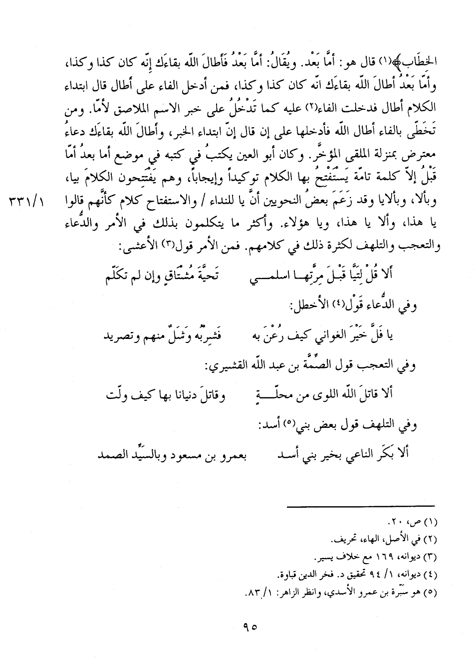الْخِطَابِ} قال هو: أمَّا بَعْد. ويُقال: أمَّا بَعْدُ فأطال الله بقاءك إنه كان كذا وكذا، وأمّا بَعْدُ أطال الله بقاءك أنه كان كذا وكذا، فمن أدخل الفاء على أطال قال ابتداء الكلام أطال فدخلت الفاء عليه كما تدخُلُ على خبر الاسم الملاصق لأمّا. ومن تخطى بالفاء أطال الله فأدخلها على إن قال إن ابتداء الخبر، وأطال الله بقاءك دعاء معترض بمنزلة الملقى المؤخر. وكان أبو العين يكتبُ في كتبه في موضع أما بعدُ أمّا قبلُ إلا كلمة تامة يستفتحُ بها الكلام توكيداً وإيجاباً، وهم يفتتحون الكلام بيا، وبألا، وبألايا وقد زعم بعض النحويين أن يا للنداء 1/ 331 والاستفتاح كلام كأنهم قالوا يا هذا، وألا يا هذا، ويا هؤلاء. وأكثر ما يتكلمون بذلك في الأمر والدعاء والتعجب والتلهف لكثرة ذلك في كلامهم. فمن الأمر قول الأعشى: