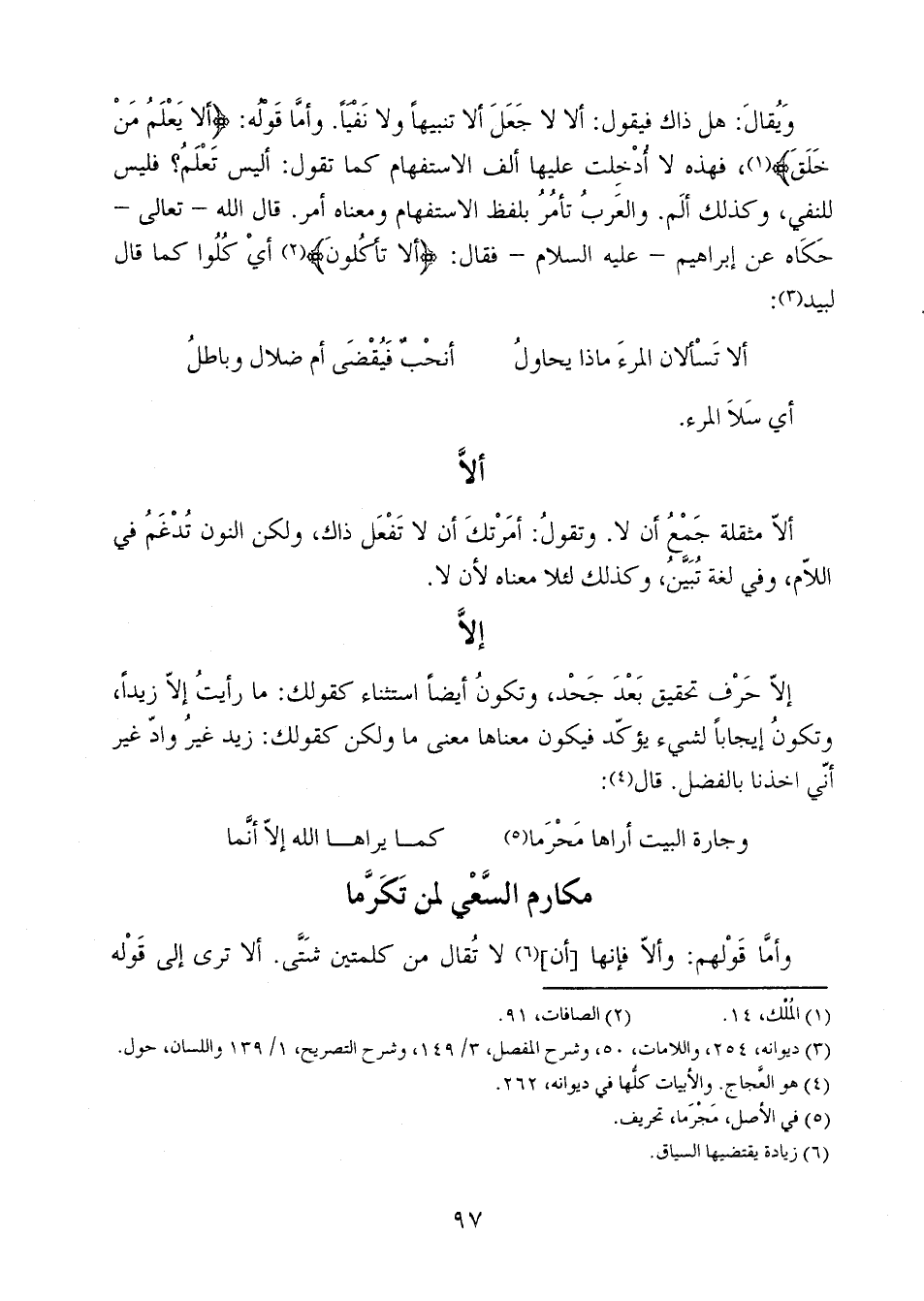 ويقال: هل ذاك فيقول: ألا لا جعَلَ ألا تنبيهاً ولا نفياً. وأمَّا قوله: {أَلا يَعْلَمُ مَنْ خَلَقَ}، فهذه لا أدخلت عليها ألف الاستفهام كما تقول: أليس تَعْلَمُ؟ فليس للنفي، وكذلك ألم. والعربُ تأمرُ بلفظ الاستفهام ومعناه أمر. قال الله - تعالى- حكاه عن إبراهيم - عليه السلام- فقال: {أَلا تَاكُلُونَ} أي كُلوا كما قال لبيد: