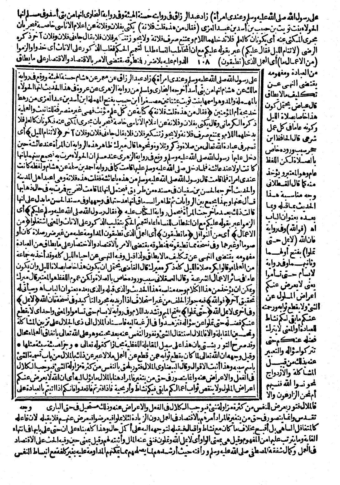 عِبَادَةِ اللَّهِ تَعَالَى مِنْ صَلَاةٍ وَذِكْرٍ وَتِلَاوَةٍ وَنَحْوِهَا قَالَ مِيرَكُ: ظَاهِرُ هَذِهِ الرِّوَايَةِ أَنَّ الْمَرْأَةَ كَانَتْ عِنْدَ عَائِشَةَ حِينَ دَخَلَ عَلَيْهَا رَسُولُ اللَّهِ - صَلَّى اللَّهُ عَلَيْهِ وَسَلَّمَ - وَوَقَعَ فِي رِوَايَةِ الزُّهْرِيِّ عِنْدَ مُسْلِمٍ أَنَّ الْحَوْلَاءَ مَرَّتْ بِهِ، فَيُجْمَعُ بَيْنَهُمَا بِأَنَّهَا كَانَتْ أَوَّلًا عِنْدَ عَائِشَةَ فَلَمَّا دَخَلَ - صَلَّى اللَّهُ عَلَيْهِ وَسَلَّمَ - عَلَيْهَا قَامَتْ كَمَا فِي رِوَايَةِ أَحْمَدَ بْنِ سَلَمَةَ عَنْ هِشَامٍ وَلَفْظُهُ: كَانَتْ عِنْدِي امْرَأَةٌ فَلَمَّا قَامَتْ قَالَ رَسُولُ اللَّهِ - صَلَّى اللَّهُ عَلَيْهِ وَسَلَّمَ - مَنْ هَذِهِ يَا عَائِشَةُ فَقُلْتُ هَذِهِ فُلَانَةُ، وَهِيَ أَعْبَدُ أَهْلِ الْمَدِينَةِ، الْحَدِيثَ أَخْرَجَهُ الْحَسَنُ بْنُ سُفْيَانَ فِي مُسْنَدِهِ مِنْ طَرِيقٍ فَيُحْتَمَلُ أَنَّهَا قَامَتْ لِتَخْرُجَ فَمَرَّتْ بِهِ فِي حَالِ ذَهَابِهَا فَسَأَلَ عَنْهَا، وَبِهَذَا يُجْمَعُ بَيْنَ الرِّوَايَاتِ ثُمَّ ظَاهِرُ السِّيَاقِ أَنَّهَا مَدَحَتْهَا فِي وَجْهِهَا، وَفِي مُسْنَدِ الْحَسَنِ مَا يَدُلُّ عَلَى أَنَّهَا قَالَتْ ذَلِكَ بَعْدَمَا خَرَجَتِ الْمَرْأَةُ، فَيُحْمَلُ رِوَايَةُ الْكِتَابِ عَلَيْهِ (فَقَالَ رَسُولُ اللَّهِ - صَلَّى اللَّهُ عَلَيْهِ وَسَلَّمَ - عَلَيْكُمْ) أَيِ: الْزَمُوا، عَبَّرَ بِقَوْلِهِ عَلَيْكُمْ مَعَ أَنَّ الْخِطَابَ لِلنِّسَاءِ إِيمَاءٌ لِتَعْمِيمِ الْحُكْمِ بِتَغْلِيبِ الذُّكُورِ عَلَى الْإِنَاثِ، وَالْمَعْنَى اشْتَغِلُوا (مِنَ الْأَعْمَالِ) أَيْ: مِنَ النَّوَافِلِ (مَا تُطِيقُونَ) أَيِ: الْعَمَلَ الَّذِي تُطِيقُونَ الْمُدَاوَمَةَ عَلَيْهِ مِنْ غَيْرِ ضَرَرٍ صَلَاةً كَانَ أَوْ صَوْمًا أَوْ غَيْرَهُمَا، وَفِي نُسْخَةٍ مِمَّا تُطِيقُونَهُ فَمُتَطَوِّقُهُ يَقْتَضِي الْأَمْرَ بِالِاقْتِصَادِ وَالِاخْتِصَارِ عَلَى مَا يُطَاقُ مِنَ الْعِبَادَةِ، وَمَفْهُومُهُ يَقْتَضِي النَّهْيَ عَنْ تَكْلِيفِ مَا لَا يُطَاقُ، وَلِذَا قِيلَ فِيهِ النَّهْيُ عَنْ إِحْيَاءِ اللَّيْلِ كُلِّهِ وَقَدْ أَخَذَ بِهِ جَمَاعَةٌ مِنَ الْعُلَمَاءِ، وَقَالُوا: يُكْرَهُ صَلَاةُ اللَّيْلِ كُلِّهِ ذَكَرَهُ مِيرَكُ، قَالَ الْقَاضِي: يُحْتَمَلُ أَنْ يَكُونَ هَذَا خَاصًّا بِصَلَاةِ اللَّيْلِ، وَأَنْ يَكُونَ عَامًّا فِي سَائِرِ الْأَعْمَالِ الشَّرْعِيَّةِ، وَقَالَ الْعَسْقَلَانِيُّ: سَبَبُ وُرُودِهِ خَاصٌّ بِالصَّلَاةِ، وَلَكِنَّ عُمُومَ اللَّفْظِ هُوَ الْمُعْتَبَرُ قَالَ مِيرَكُ: وَيُمْكِنُ أَنْ يُؤْخَذَ مِنْ هَذَا الْكَلَامِ وَجْهُ مُنَاسَبَةِ هَذَا الْحَدِيثِ، وَالَّذِي قَبْلَهُ وَالَّذِي بَعْدَهُ بِعُنْوَانِ الْبَابِ انْتَهَى، وَسَيَأْتِي لَهُ تَحْقِيقٌ آخَرُ.