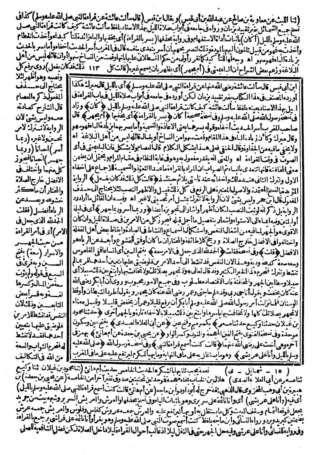 بْنِ أَبِي قَيْسٍ قَالَ: سَأَلْتُ عَائِشَةَ رَضِيَ اللَّهُ عَنْهَا عَنْ قِرَاءَةِ النَّبِيِّ - صَلَّى اللَّهُ عَلَيْهِ وَسَلَّمَ -) أَيْ: بِاللَّيْلِ، قَالَ مِيرَكُ: هَكَذَا أَوْرَدَ المص فِي هَذَا الْكِتَابِ بِغَيْرِ تَقْيِيدٍ بِزَمَانٍ لَكِنْ أَوْرَدَهُ فِي جَامِعِهِ فِي أَبْوَابِ صَلَاةِ اللَّيْلِ فِي بَابِ الْقِرَاءَةِ فِي اللَّيْلِ بِهَذَا الْإِسْنَادِ بِعَيْنِهِ بِلَفْظِ سَأَلْتُ عَائِشَةَ كَيْفَ كَانَتْ قِرَاءَةُ النَّبِيِّ - صَلَّى اللَّهُ عَلَيْهِ وَسَلَّمَ - بِاللَّيْلِ (كَانَ) وَزَادَ فِي نُسْخَةٍ: رَسُولُ اللَّهِ - صَلَّى اللَّهُ عَلَيْهِ وَسَلَّمَ - وَفِي نُسْخَةٍ صَحِيحَةٍ: أَكَانَ (يُسِرُّ بِالْقِرَاءَةِ) أَيْ: يُخْفِيهَا (أَمْ يَجْهَرُ) قَالَ صَاحِبُ الْمُغْرِبِ: أَسَّرَ الْحَدِيثَ أَخْفَاهُ، وَقَوْلُهُ يُسِرُّهُمَا يَعْنِي الْإِعَادَةَ، وَالتَّسْمِيَةَ وَأَمَّا يُسِرُ بِهِمَا بِزِيَادَةِ الْبَاءِ، فَهُوَ سَهْوٌ، وَقَالَ مِيرَكُ: وَكَأَنَّ زِيَادَةَ الْبَاءِ فِي هَذَا الْمَقَامِ وَقَعَتْ سَهْوًا مِنَ النُّسَّاخِ أَوْ يُقَالُ قَائِلُهُ لَيْسَ مِنْ أَهْلِ الْبَلَاغَةِ انْتَهَى.