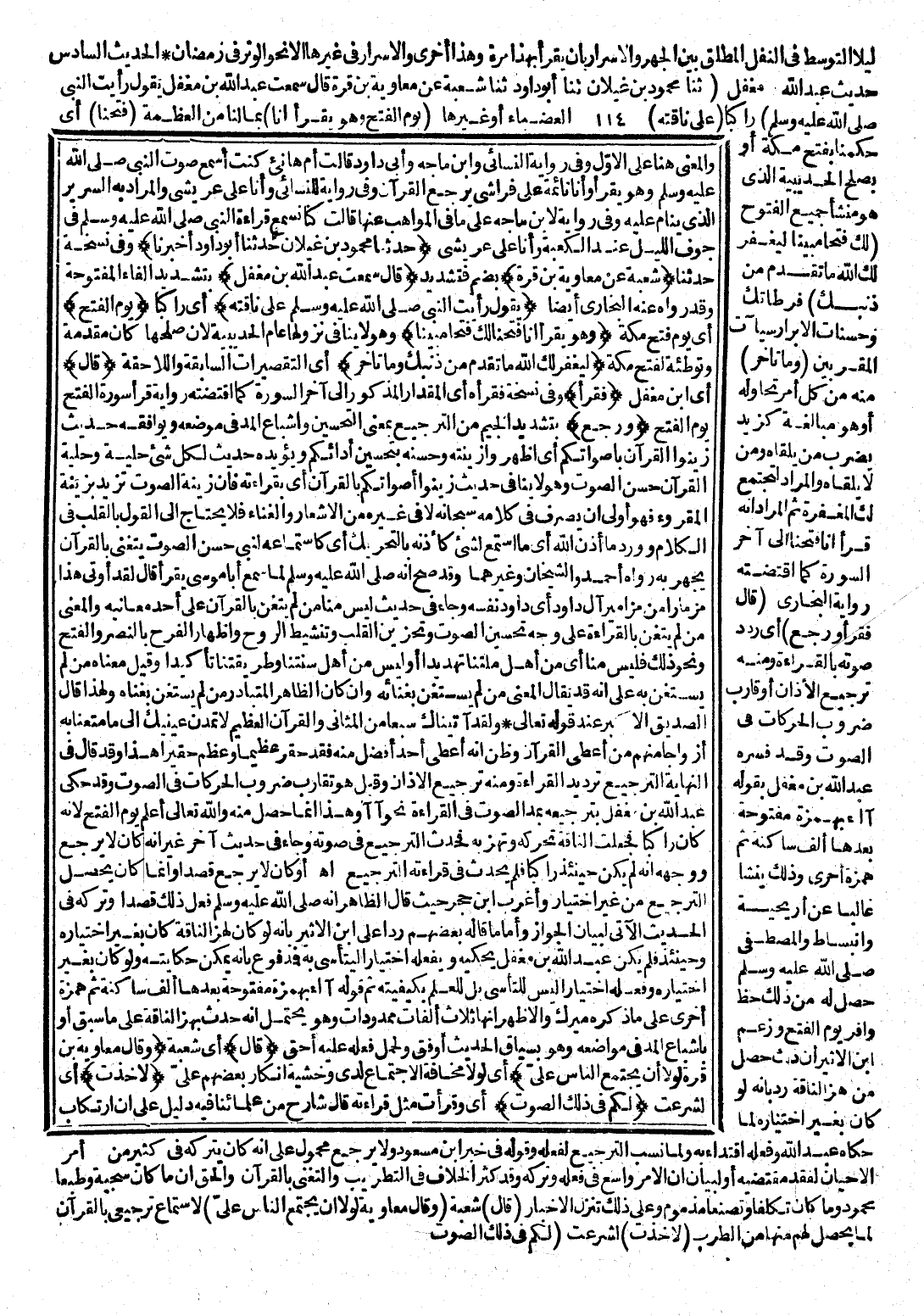 (حَدَّثَنَا مَحْمُودُ بْنُ غَيْلَانَ، أَبُو دَاوُدَ أَخْبَرَنَا) وَفِي نُسْخَةٍ حَدَّثَنَا (شُعْبَةُ عَنْ مُعَاوِيَةَ بْنِ قُرَّةَ) بِضَمٍّ فَتَشْدِيدٍ (قَالَ: سَمِعْتُ عَبْدَ اللَّهِ بْنَ مُغَفَّلٍ) بِتَشْدِيدِ الْفَاءِ الْمَفْتُوحَةِ، وَقَدْ رَوَاهُ عَنِ الْبُخَارِيِّ أَيْضًا (يَقُولُ رَأَيْتُ رَسُولَ اللَّهِ - صَلَّى اللَّهُ عَلَيْهِ وَسَلَّمَ - عَلَى نَاقَتِهِ) أَيْ: رَاكِبًا (يَوْمَ الْفَتْحِ) أَيْ: يَوْمَ فَتْحِ مَكَّةَ (وَهُوَ يَقْرَأُ إِنَّا فَتَحْنَا لَكَ فَتْحًا مُبِينًا) وَهُوَ لَا يُنَافِي نُزُولَهَا عَامَ الْحُدَيْبِيَةَ ; لِأَنَّ صُلْحَهَا كَانَ مُقَدِّمَةً، وَتَوْطِئَةً لِفَتْحِ مَكَّةَ (لِيَغْفِرَ لَكَ اللَّهُ مَا تَقَدَّمَ مِنْ ذَنْبِكَ وَمَا تَأَخَّرَ) أَيِ: التَّقْصِيرَاتِ السَّابِقَةِ، وَاللَّاحِقَةِ (قَالَ) أَيِ: ابْنُ مُغَفَّلٍ (فَقَرَأَ) وَفِي نُسْخَةٍ فَقَرَأَهُ، أَيِ: الْمِقْدَارَ الْمَذْكُورَ إِلَى آخِرِ السُّورَةِ كَمَا اقْتَضَتْهُ رِوَايَةُ قَرَأَ سُورَةَ الْفَتْحِ يَوْمَ الْفَتْحِ (وَرَجَّعَ) بِتَشْدِيدِ الْجِيمِ مِنَ التَّرْجِيعِ بِمَعْنَى التَّحْسِينِ، وَإِشْبَاعَ الْمَدِّ فِي مَوْضِعِهِ، وَيُوَافِقُهُ حَدِيثُ «زَيِّنُوا الْقُرْآنَ بِأَصْوَاتِكُمْ» أَيْ: أَظْهِرُوا زِينَتَهُ وَحُسْنَهُ بِتَحْسِينِ آدَائِكُمْ وَيُؤَيِّدُهُ حَدِيثُ: لِكُلِّ شَيْءٍ حِلْيَةٌ وَحِلْيَةُ الْقُرْآنِ حُسْنُ الصَّوْتِ، وَهُوَ لَا يُنَافِي حَدِيثَ زَيِّنُوا أَصْوَاتَكُمْ بِالْقُرْآنِ أَيْ: بِقِرَاءَتِهِ فَإِنَّ زِينَةَ الصَّوْتِ تَزِيدُ بِزِينَةِ الْمَقْرُوءِ، فَهُوَ أَوْلَى أَنْ يُصْرَفَ فِي كَلَامِهِ سُبْحَانَهُ لَا فِي غَيْرِهِ مِنَ الْأَشْعَارِ وَالْغَنَاءِ فَلَا يَحْتَاجُ إِلَى الْقَوْلِ بِالْقَلْبِ فِي الْكَلَامِ، وَوَرَدَ «مَا أَذِنَ اللَّهُ - أَيْ مَا اسْتَمَعَ لِشَيْءٍ - كَأَذَنِهِ بِالتَّحْرِيكِ - أَيْ: كَاسْتِمَاعِهِ - لِنَبِيٍّ حَسَنِ الصَّوْتِ يَتَغَنَّى بِالْقُرْآنِ يَجْهَرُ بِهِ» رَوَاهُ أَحْمَدُ وَالشَّيْخَانِ، وَغَيْرُهُمَا وَقَدْ صَحَّ أَنَّهُ - صَلَّى اللَّهُ عَلَيْهِ وَسَلَّمَ - لَمَّا سَمِعَ أَبَا مُوسَى يَقْرَأُ قَالَ: لَقَدْ أُوتِيَ هَذَا مِزْمَارًا مِنْ مَزَامِيرِ آلِ دَاوُدَ أَيْ: دَاوُدَ نَفْسِهِ.
