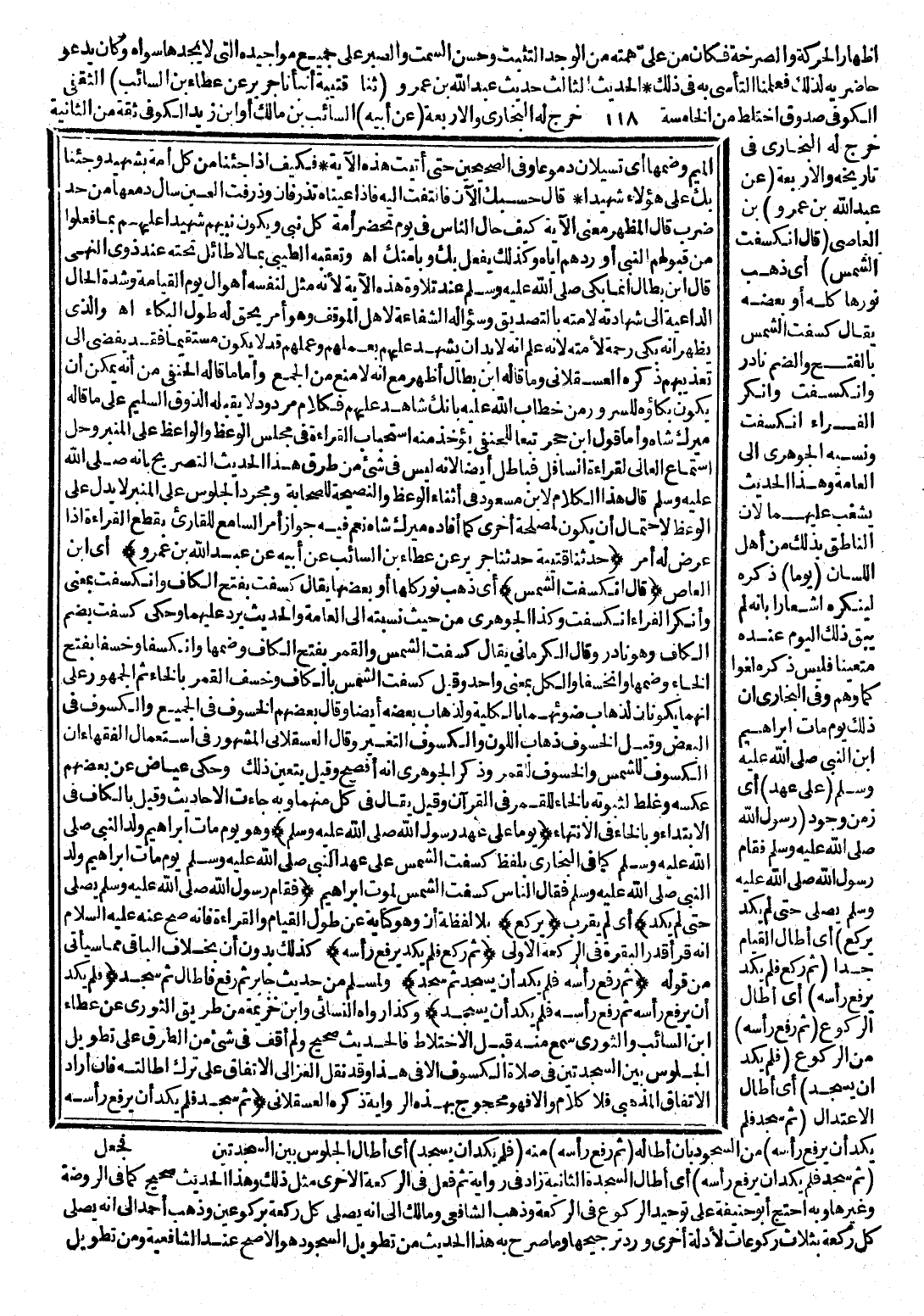 بِمَعْنَى وَأَنْكَرَ الْفَرَّاءُ انْكَسَفَ، وَكَذَا الْجَوْهَرِيُّ حَيْثُ نَسَبَهُ إِلَى الْعَامَّةِ، وَالْحَدِيثُ يُرَدُّ عَلَيْهِمَا، وَحَكَى كُسِفَتْ بِضَمِّ الْكَافِ، وَهُوَ نَادِرٌ، وَقَالَ الْكِرْمَانِيُّ: يُقَالُ كَسَفَتِ الشَّمْسُ وَالْقَمَرُ بِفَتْحِ الْكَافِ وَضَمِّهَا، وَانْكَسَفَا وَخَسَفَا بِفَتْحِ الْخَاءِ وَضَمِّهَا وَانْخَسَفَا، وَالْكُلُّ بِمَعْنًى وَاحِدٍ، وَقِيلَ كَسَفَتِ الشَّمْسُ بِالْكَافِ، وَخَسَفَ الْقَمَرُ بِالْخَاءِ ثُمَّ الْجُمْهُورُ عَلَى أَنَّهُمَا يَكُونَانِ لِذَهَابِ ضَوْئِهِمَا بِالْكُلِّيَّةِ، وَلِذَهَابِ بَعْضِهِ أَيْضًا، وَقَالَ بَعْضُهُمْ: الْخُسُوفُ فِي الْجَمْعِ، وَالْكُسُوفُ فِي الْبَعْضِ وَقِيلَ الْخُسُوفُ ذَهَابُ اللَّوْنِ، وَالْكُسُوفُ التَّغَيُّرُ، وَقَالَ الْعَسْقَلَانِيُّ: الْمَشْهُورُ فِي اسْتِعْمَالِ الْفُقَهَاءِ أَنَّ الْكُسُوفَ لِلشَّمْسِ وَالْخُسُوفَ لِلْقَمَرِ، وَذَكَرَ الْجَوْهَرِيُّ أَنَّهُ أَفْصَحُ، وَقِيلَ يَتَعَيَّنُ ذَلِكَ، وَحَكَى عِيَاضٌ عَنْ بَعْضِهِمْ عَكْسَهُ، وَغُلِّطَ لِثُبُوتِهِ بِالْخَاءِ لِلْقَمَرِ فِي الْقُرْآنِ، وَقِيلَ يُقَالُ فِي كُلٍّ مِنْهُمَا، وَبِهِ جَاءَتِ الْأَحَادِيثُ، وَقِيلَ بِالْكَافِ فِي الِابْتِدَاءِ، وَبِالْخَاءِ فِي الِانْتِهَاءِ (يَوْمًا عَلَى عَهْدِ رَسُولِ اللَّهِ - صَلَّى اللَّهُ عَلَيْهِ وَسَلَّمَ -) وَهُوَ يَوْمَ مَاتَ إِبْرَاهِيمُ وَلَدُ النَّبِيِّ - صَلَّى اللَّهُ عَلَيْهِ وَسَلَّمَ - كَمَا فِي الْبُخَارِيِّ بِلَفْظِ كَسَفَتِ الشَّمْسُ عَلَى عَهْدِ النَّبِيِّ - صَلَّى اللَّهُ عَلَيْهِ وَسَلَّمَ - يَوْمَ مَاتَ إِبْرَاهِيمُ وَلَدُ النَّبِيِّ - صَلَّى اللَّهُ عَلَيْهِ وَسَلَّمَ - فَقَالَ النَّاسُ: كَسَفَتِ الشَّمْسُ لِمَوْتِ إِبْرَاهِيمَ (فَقَامَ رَسُولُ اللَّهِ - صَلَّى اللَّهُ عَلَيْهِ وَسَلَّمَ - يُصَلِّي حَتَّى لَمْ يَكَدْ) أَيْ: لَمْ يَقْرُبْ (يَرْكَعُ) بِلَا لَفْظَةِ (أَنْ) وَهُوَ كِنَايَةٌ عَنْ طُولِ الْقِيَامِ وَالْقِرَاءَةِ ; فَإِنَّهُ صَحَّ عَنْهُ عَلَيْهِ السَّلَامُ أَنَّهُ قَرَأَ قَدْرَ الْبَقَرَةِ فِي الرَّكْعَةِ الْأَوْلَى (ثُمَّ رَكَعَ فَلَمْ يَكَدْ يَرْفَعُ رَأْسَهُ) كَذَلِكَ بِدُونِ أَنْ بِخِلَافِ الْبَاقِي مِمَّا سَيَأْتِي مِنْ قَوْلِهِ (ثُمَّ رَفَعَ رَأْسَهُ فَلَمْ يَكَدْ أَنْ يَسْجُدَ ثُمَّ سَجَدَ) ، وَلِمُسْلِمٍ مِنْ حَدِيثِ جَابِرٍ ثُمَّ رَفَعَ فَأَطَالَ ثُمَّ سَجَدَ (فَلَمْ يَكَدْ أَنْ يَرْفَعَ رَأْسَهُ ثُمَّ رَفَعَ رَأْسَهُ فَلَمْ يَكَدْ أَنْ يَسْجُدَ) وَكَذَا رَوَاهُ النَّسَائِيُّ وَابْنُ خُزَيْمَةَ مِنْ طَرِيقِ الثَّوْرِيِّ عَنْ عَطَاءِ بْنِ السَّائِبِ، وَالثَّوْرِيُّ سُمِعَ مِنْهُ قَبْلَ الِاخْتِلَاطِ، فَالْحَدِيثُ صَحِيحٌ، وَلَمْ أَقِفْ فِي شَيْءٍ مِنَ الطُّرُقِ عَلَى تَطْوِيلِ الْجُلُوسِ بَيْنَ السَّجْدَتَيْنِ فِي صَلَاةِ الْكُسُوفِ إِلَّا فِي هَذَا، وَقَدْ نَقَلَ الْغَزَّالِيُّ الِاتِّفَاقَ عَلَى تَرْكِ إِطَالَتِهِ، فَإِنْ أَرَادَ الِاتِّفَاقَ الْمَذْهَبِيَّ فَلَا كَلَامَ، وَإِلَّا فَهُوَ مَحْجُوجٌ بِهَذِهِ الرِّوَايَةِ ذَكَرَهُ الْعَسْقَلَانِيُّ (ثُمَّ سَجَدَ فَلَمْ يَكَدْ أَنْ يَرْفَعَ رَأْسَهُ