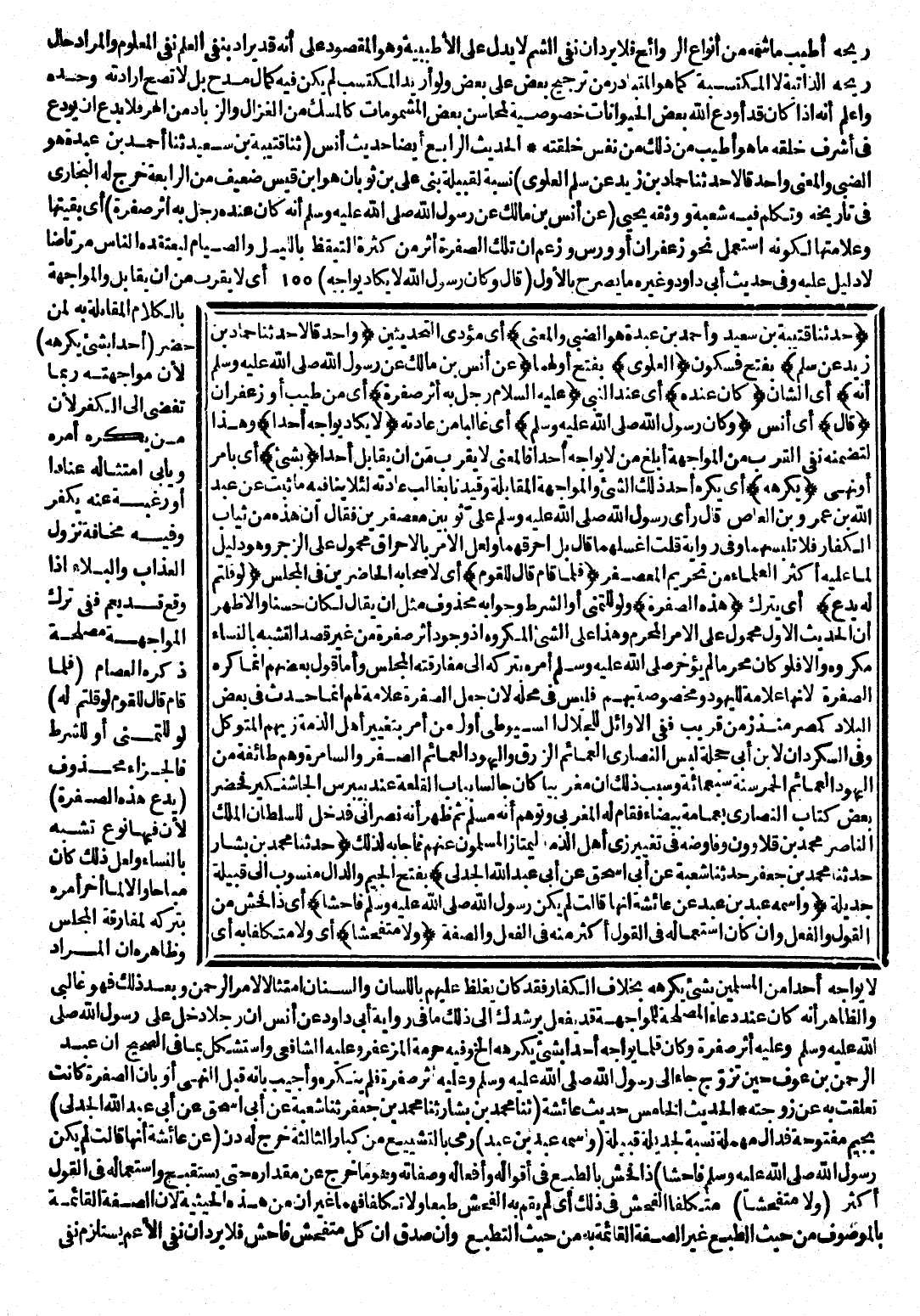 (حَدَّثَنَا قُتَيْبَةُ بْنُ سَعِيدٍ وَأَحْمَدُ بْنُ عَبْدَةَ هُوَ الضَّبِّيُّ، وَالْمَعْنَى) أَيْ: مُؤَدَّى التَّحْدِيثَيْنِ (وَاحِدٌ قَالَا حَدَّثَنَا حَمَّادُ بْنُ زَيْدٍ عَنْ سَلْمٍ) بِفَتْحٍ فَسُكُونٍ (الْعَلَوِيِّ) بِفَتْحِ أَوَّلِهِمَا (عَنْ أَنَسِ بْنِ مَالِكٍ عَنْ رَسُولِ اللَّهِ - صَلَّى اللَّهُ عَلَيْهِ وَسَلَّمَ - أَنَّهُ) أَيِ: الشَّأْنَ (كَانَ عِنْدَهُ) أَيْ: عِنْدَ النَّبِيِّ (- عَلَيْهِ السَّلَامُ - رَجُلٌ بِهِ أَثَرُ صُفْرَةٍ) أَيْ: مِنْ طِيبٍ أَوْ زَعْفَرَانٍ (قَالَ) أَيْ: أَنَسٌ (وَكَانَ رَسُولُ اللَّهِ - صَلَّى اللَّهُ عَلَيْهِ وَسَلَّمَ -) أَيْ: غَالِبًا مِنْ عَادَتِهِ (لَا يَكَادُ يُوَاجِهُ أَحَدًا) وَهَذَا لِتَضَمُّنِهِ نَفْيَ الْقُرْبِ مِنَ الْمُوَاجَهَةِ أَبْلَغُ مِنْ «لَا يُوَاجِهُ أَحَدًا» ، فَالْمَعْنَى: لَا يَقْرُبُ مِنْ أَنْ يُقَابِلَ أَحَدًا (بِشَيْءٍ) أَيْ: بِأَمْرٍ أَوْ نَهْيٍ (يَكْرَهُهُ) أَيْ: يَكْرَهُ أَحَدٌ ذَلِكَ الشَّيْءَ، وَالْمُوَاجَهَةُ: الْمُقَابَلَةُ.