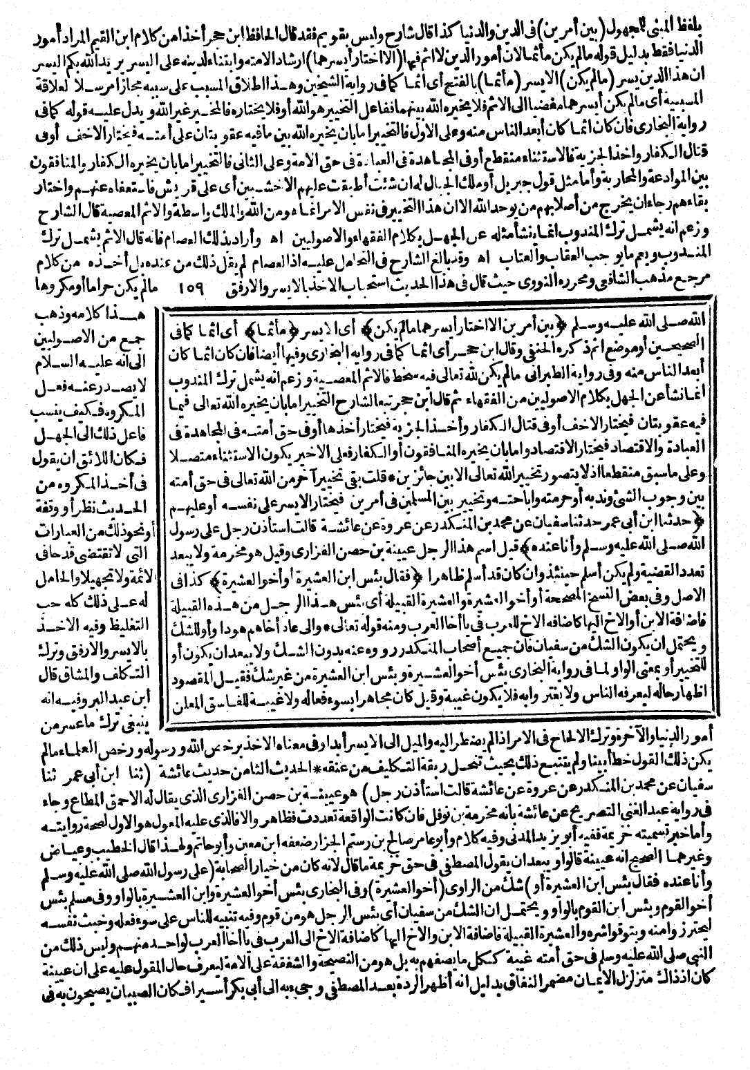 بَيْنَ أَمْرَيْنِ إِلَّا اخْتَارَ أَيْسَرَهُمَا مَا لَمْ يَكُنْ) أَيِ: الْأَيْسَرُ (مَأْثَمًا) أَيْ: إِثْمًا كَمَا فِي الصَّحِيحَيْنِ أَوْ مَوْضِعَ إِثْمٍ ذَكَرَهُ الْحَنَفِيُّ، وَقَالَ ابْنُ حَجَرٍ: أَيْ: إِثْمًا كَمَا فِي رِوَايَةِ الْبُخَارِيِّ، وَفِيهَا أَيْضًا فَإِنْ كَانَ إِثْمًا كَانَ أَبْعَدَ النَّاسِ مِنْهُ، وَفِي رِوَايَةِ الطَّبَرَانِيِّ (مَا لَمْ يَكُنْ لِلَّهِ تَعَالَى فِيهِ سَخَطٌ فَالْإِثْمُ الْمَعْصِيَةُ وَزَعَمَ أَنَّهُ يَشْمَلُ تَرْكَ الْمَنْدُوبِ إِنَّمَا نَشَأَ عَنِ الْجَهْلِ بِكَلَامِ الْأُصُولِيِّينَ مِنَ الْفُقَهَاءِ، ثُمَّ قَالَ ابْنُ حَجَرٍ: تَبَعًا لِشَارِحِ التَّخْيِيرِ إِمَّا بِأَنْ يُخَيِّرَهُ اللَّهُ تَعَالَى فِيمَا فِيهِ عُقُوبَتَانِ فَيَخْتَارُ الْأَخَفَّ أَوْ فِي قِتَالِ الْكُفَّارِ وَأَخْذِ الْجِزْيَةِ فَيَخْتَارُ أَخْذَهَا أَوْ فِي حَقِّ أُمَّتِهِ فِي الْمُجَاهَدَةِ فِي الْعِبَادَةِ وَالِاقْتِصَادِ فَيَخْتَارُ الِاقْتِصَادَ، وَإِمَّا بِأَنْ يُخَيِّرَهُ الْمُنَافِقُونَ وَالْكُفَّارُ فَعَلَى الْأَخِيرِ يَكُونُ الِاسْتِثْنَاءُ مُتَّصِلًا وَعَلَى مَا سَبَقَ مُنْقَطِعًا إِذْ لَا يُتَصَوَّرُ تَخْيِيرُ اللَّهِ تَعَالَى إِلَّا بَيْنَ جَائِزَيْنِ قُلْتُ بَقِيَ تَخْيِيرٌ آخَرُ مِنَ اللَّهِ تَعَالَى فِي حَقِّ أُمَّتِهِ بَيْنَ وُجُوبِ الشَّيْءِ وَنَدْبِهِ أَوْ حُرْمَتِهِ وَإِبَاحَتِهِ وَتَخْيِيرٌ بَيْنَ الْمُسْلِمِينَ لَهُ فِي أَمْرَيْنِ فَيَخْتَارُ الْأَيْسَرَ عَلَى نَفْسِهِ أَوْ عَلَيْهِمْ.