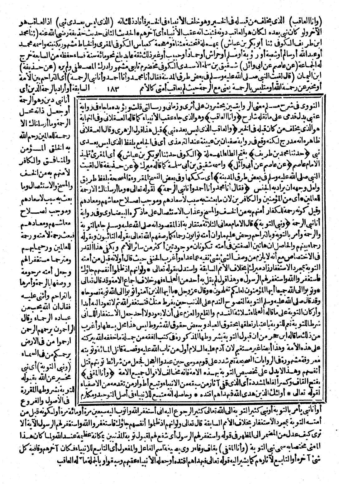 النَّوَوِيُّ فِي شَرْحِ مُسْلِمٍ: مَعْنَى الرِّوَايَتَيْنِ يُحْشَرُونَ عَلَى أَثَرِي وَزَمَانِي وَرِسَالَتِي قُلْتُ وَيُؤَيِّدُهُ مَا جَاءَ فِي رِوَايَةِ عَقِبِي بَدَلَ قَدَمِي عَلَى مَا نَقَلَهُ شَارِحٌ (وَأَنَا الْعَاقِبُ) وَهُوَ جَاءَ عَقِبَ الْأَنْبِيَاءِ كَمَا قَالَهُ الْعَسْقَلَانِيُّ، وَفِي النِّهَايَةِ هُوَ الَّذِي يَخْلُفُ مَنْ كَانَ قَبْلَهُ فِي الْخَيْرِ (وَالْعَاقِبُ الَّذِي لَيْسَ بَعْدَهُ نَبِيٌّ) قِيلَ هَذَا قَوْلُ الزُّهْرِيِّ، وَقَالَ الْعَسْقَلَانِيُّ: ظَاهِرُهُ أَنَّهُ مُدْرَجٌ وَقَعَ لَكِنَّهُ فِي رِوَايَةِ سُفْيَانَ بْنِ عُيَيْنَةَ عِنْدَ التِّرْمِذِيِّ أَيْ: فِي الْجَامِعِ بِلَفْظِ الَّذِي لَيْسَ بَعْدِي نَبِيٌّ.