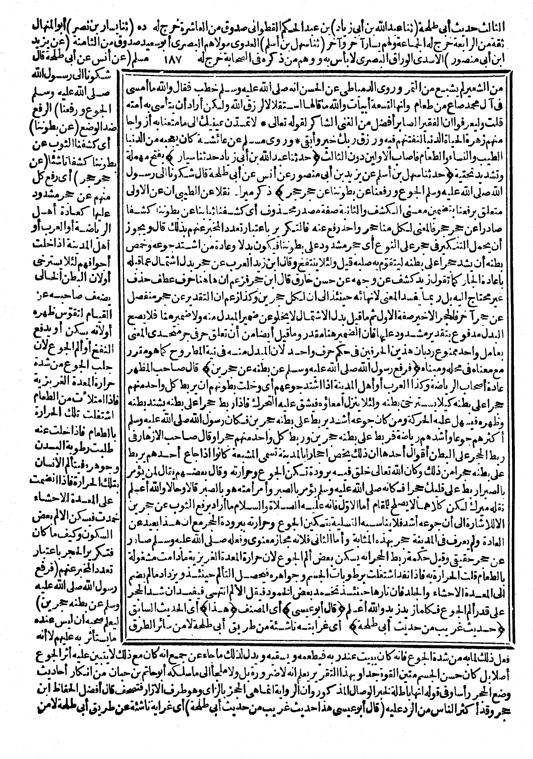 (حَدَّثَنَا عَبْدُ اللَّهِ بْنُ أَبِي زِيَادٍ حَدَّثَنَا سَيَّارٌ) بِفَتْحِ مُهْمَلَةٍ وَتَشْدِيدِ تَحْتِيَّةٍ (حَدَّثَنَا سَهْلُ بْنُ أَسْلَمَ عَنْ يَزِيدَ بْنِ أَبِي مَنْصُورٍ عَنْ أَنَسٍ عَنْ أَبِي طَلْحَةَ قَالَ شَكَوْنَا إِلَى رَسُولِ اللَّهِ - صَلَّى اللَّهُ عَلَيْهِ وَسَلَّمَ - الْجُوعَ وَرَفَعْنَا عَنْ بُطُونِنَا عَنْ حَجَرٍ حَجَرٍ) ذَكَرَ مِيرَكُ نَقْلًا عَنِ الطِّيبِيِّ أَنَّ عَنِ الْأُولَى مُتَعَلِّقٌ بِرَفَعْنَا يَتَضَمَّنُ مَعْنَى الْكَشْفِ وَالثَّانِيَةُ صِفَةُ مَصْدَرٍ مَحْذُوفٍ، أَيْ: كَشَفْنَا ثِيَابَنَا عَنْ بُطُونِنَا كَشْفًا صَادِرًا عَنْ حَجَرٍ حَجَرٍ، فَالْمَعْنَى لَكَ مِنَّا حَجَرٌ وَاحِدٌ رُفِعَ عَنْهُ فَالتَّكْرِيرُ بِاعْتِبَارِ تَعَدُّدِ الْمُخْبِرِ عَنْهُمْ بِذَلِكَ قَالَ: وَيَجُوزُ أَنْ يُحْمَلَ التَّنْكِيرُ فِي حَجَرٍ عَلَى النَّوْعِ أَيْ: حَجَرٍ مَشْدُودٍ عَلَى بُطُونِنَا فَيَكُونُ بَدَلًا، وَعَادَةُ مَنِ اشْتَدَّ جُوعُهُ وَخَمَصَ بَطْنُهُ أَنْ يَشُدَّ حَجَرًا عَلَى بَطْنِهِ لِيَتَقَوَّمَ بِهِ صُلْبُهُ، قِيلَ وَلِئَلَّا يَنْتَفِخَ، وَقَالَ زَيْنُ الْعَرَبِ: عَنْ حَجَرٍ بَدَلُ اشْتِمَالٍ عَمَّا قَبْلَهُ بِإِعَادَةِ الْجَارِّ كَمَا تَقُولُ: زَيْدٌ كَشَفَ عَنْ وَجْهِهِ عَنْ حُسْنٍ خَارِقٍ، قَالَ ابْنُ حَجَرٍ: فَزُعِمَ أَنَّ هَاهُنَا حَرْفَ عَطْفٍ حُذِفَ غَيْرَ مُحْتَاجٍ إِلَيْهِ بَلْ رُبَّمَا يَفْسُدُ الْمَعْنَى لِإِنْهَائِهِ حِينَئِذٍ أَنْ لِكُلٍّ حَجَرَيْنِ، وَكَذَا زُعِمَ أَنَّ التَّقْدِيرَ: عَنْ حَجَرٍ مُنْفَصِلٍ عَنْ حَجَرٍ آخَرَ، فَالْحَجَرُ الْأَخِيرُ صِفَةُ الْأَوَّلِ، ثُمَّ مَا قِيلَ بَدَلُ الِاشْتِمَالِ لَا يَخْلُو عَنْ ضَمِيرِ الْمُبْدَلِ مِنْهُ، وَلَا ضَمِيرَ هُنَا، فَلَا يَصِحُّ الْبَدَلُ مَدْفُوعٌ بِتَقْدِيرِ مَشْدُودٍ عَلَيْهَا فَإِنَّ الضَّمِيرَ هُنَا مُقَدَّرٌ وَمَا قِيلَ أَيْضًا مِنْ أَنَّ تَعَلُّقَ حَرْفَيْ جَرٍّ مُتَّحِدَيِ الْمَعْنَى بِعَامِلٍ وَاحِدٍ مَمْنُوعٌ رُدَّ بِأَنَّ هَذَيْنِ الْحَرْفَيْنِ فِي حُكْمِ حَرْفٍ وَاحِدٍ؛ لِأَنَّ الْمُبْدَلَ مِنْهُ فِي نِيَّةِ الْمَطْرُوحِ كَمَا هُوَ مُقَرَّرٌ مَعَ مَعْنَاهُ فِي مَحَلِّهِ وَمَبْنَاهُ (فَرَفَعَ رَسُولُ اللَّهِ - صَلَّى اللَّهُ عَلَيْهِ وَسَلَّمَ - عَنْ بَطْنِهِ عَنْ حَجَرَيْنِ) قَالَ صَاحِبُ الْمُظْهِرِ: عَادَةُ أَصْحَابِ