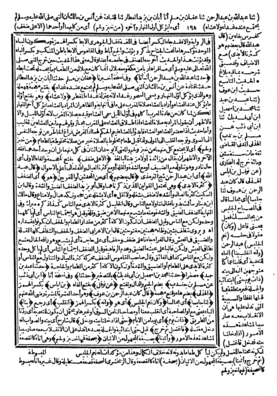 (حَدَّثَنَا عَبْدُ اللَّهِ بْنُ عَبْدِ الرَّحْمَنِ أَنْبَأَنَا) وَفِي نُسْخَةٍ أَخْبَرَنَا (عُثْمَانُ بْنُ مُسْلِمٍ حَدَّثَنَا أَبَانُ بْنُ يَزِيدَ الْعَطَّارُ، حَدَّثَنَا قَتَادَةُ عَنْ أَنَسِ بْنِ مَالِكٍ أَنَّ النَّبِيَّ - صَلَّى اللَّهُ عَلَيْهِ وَسَلَّمَ - لَمْ يَجْتَمِعْ عِنْدَهُ غَدَاءٌ) بِفَتْحِ مُعْجَمَةٍ فَمُهْمَلَةٍ، وَهُوَ الَّذِي يُؤْكَلُ أَوَّلَ النَّهَارِ، وَيُسَمَّى السُّحُورُ غَدَاءً؛ لِأَنَّهُ بِمَنْزِلَةِ غَدَاءِ الْمُفْطِرِ (وَلَا عَشَاءٌ) وَهُوَ بِفَتْحِ أَوَّلِهِ: مَا يُؤْكَلُ عِنْدَ الْعَشَاءِ، وَأَرَادَ بِالْعَشَاءِ صَلَاةَ الْمَغْرِبِ عَلَى مَا فِي النِّهَايَةِ، وَالظَّاهِرُ أَنَّ الْمُرَادَ بِالْعَشَاءِ مَا يُؤْكَلُ آخِرَ النَّهَارِ، لَكِنْ لَمَّا كَانَ مِنْ عَادَةِ الْعَرَبِ أَكْلُهُمْ فِي أَوَّلِ اللَّيْلِ سُمِّيَ الْعَشَاءَ وَقَيَّدَهُ بِصَلَاةِ الْمَغْرِبِ؛ لِأَنَّهُ أَوَّلُ اللَّيْلِ، وَإِلَّا فَالْأَظْهَرُ أَنْ يَقُولَ الْمُرَادُ بِهِ صَلَاةُ الْعِشَاءِ، إِذْ إِطْلَاقُ الْعِشَاءِ عَلَى الْمَغْرِبِ مَجَازٌ، وَقَوْلُهُمْ مَا بَيْنَ الْعِشَاءَيْنِ تَغْلِيبٌ، وَأَمَّا حَدِيثُ (إِذَا حَضَرَ الْعَشَاءُ وَالْعِشَاءُ فَابْدَءُوا بِالْعَشَاءِ) فَيَعُمُّ الْحُكْمُ لَهُمَا، إِذِ الْغَرَضُ فَرَاغُ الْخَاطِرِ عَنْ تَوَجُّهِ النَّفْسِ إِلَى السِّوَى وَتَوْجِيهُ الْقَلْبِ إِلَى الْمَوْلَى، وَلِذَا قِيلَ: طَعَامٌ مَخْلُوطٌ بِالصَّلَاةِ خَيْرٌ مِنْ صَلَاةٍ مَخْلُوطَةٍ بِالطَّعَامِ (مِنْ خُبْزٍ وَلَحْمٍ) أَيْ: لَا يَجْتَمِعُ كُلٌّ مِنْهُمَا فِي خُبْزٍ وَلَحْمٍ، وَالْمَعْنَى لَا يُوجَدَانِ اثْنَانِ فِي كُلٍّ مِنْهُمَا، بَلْ إِنْ وُجِدَ أَحَدُهُمَا فُقِدَ الْآخَرُ، وَالْأَظْهَرُ أَنْ يُقَالَ «مِنْ» زَائِدَةٌ أَوْ لَا يُوجَدُ مَزِيدٌ لِلْمُبَالَغَةِ (إِلَّا عَلَى ضَفَفٍ) بِفَتْحِ الْمُعْجَمَةِ وَالْفَاءِ الْأُولَى، أَيْ: عَلَى حَالٍ نَادِرٍ، وَهُوَ تَنَاوُلُهُ مَعَ ضَيْفِ عَبْدِ الرَّحْمَنِ شَيْخِ التِّرْمِذِيِّ (قَالَ بَعْضُهُمْ) أَيْ: مِنَ الْمُحَدِّثِينَ وَاللُّغَوِيِّينَ (هُوَ) أَيِ: الضَّفَفُ (كَثْرَةُ الْأَيْدِي) وَهِيَ تَحْتَمِلُ الْقَوْلَيْنِ اللَّذَيْنِ ذَكَرْنَاهُمَا، وَقَالَ أَبُو يَزِيدَ: الضَّفَفُ الضِّيقُ وَالشِّدَّةُ، وَقَالَ ابْنُ السِّكِّيتِ كَثْرَةُ الْعِيَالِ وَأَنْشَدَ.