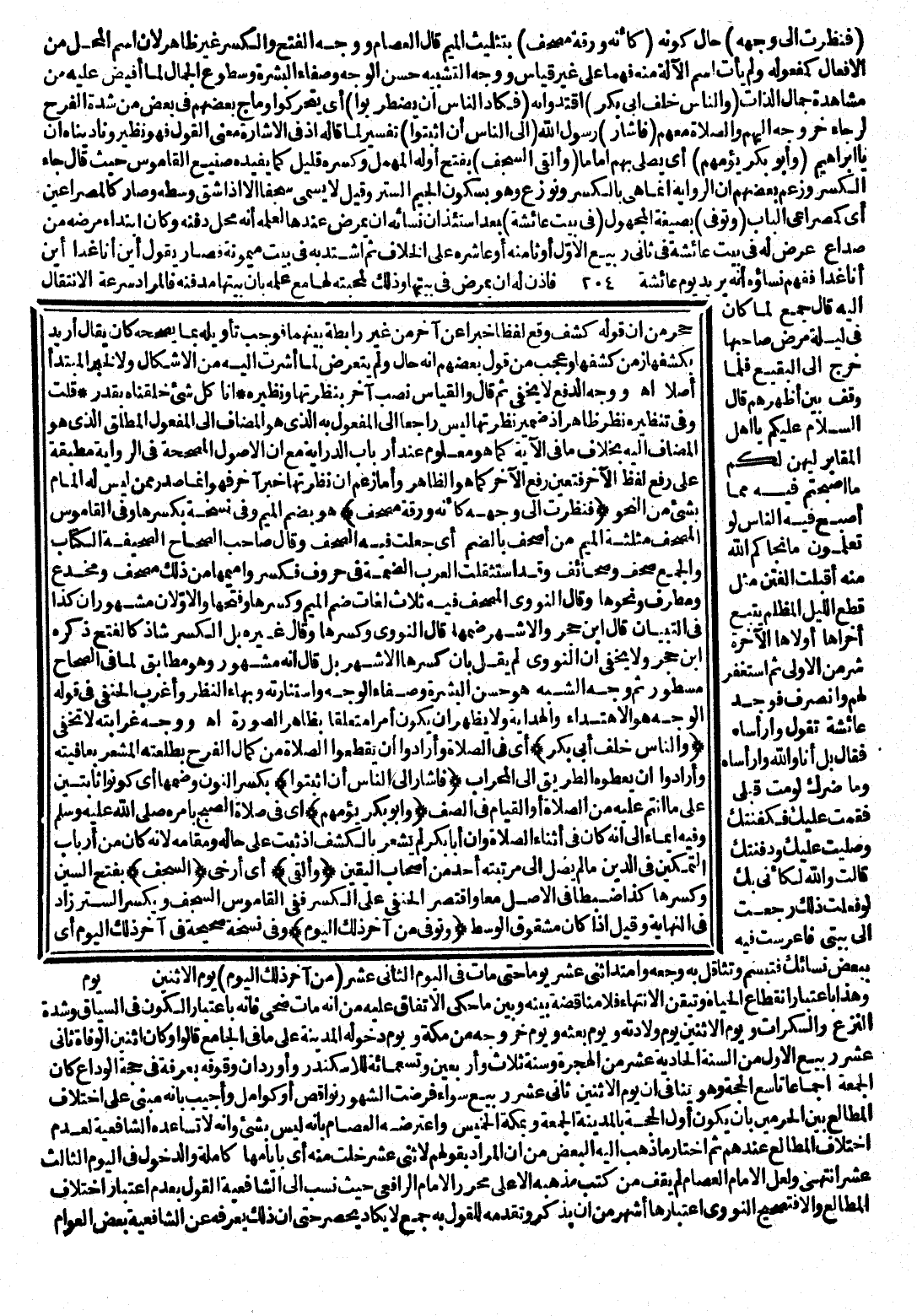 حَجَرٍ مِنْ أَنَّ قَوْلَهُ كَشَفَ وَقَعَ لَفْظًا خَبَرًا عَنْ «آخِرُ» مِنْ غَيْرِ رَابِطٍ بَيْنَهُمَا فَوَجَبَ تَأْوِيلُهُ بِمَا يُصَحِّحُهُ كَأَنْ يُقَالَ: أُرِيدَ بِكَشْفِهَا زَمَنُ كَشْفِهَا، وَعَجِبَ مِنْ قَوْلِ بَعْضِهِمْ أَنَّهُ حَالٌ وَلَمْ يَتَعَرَّضْ لِمَا أَشَرْتُ إِلَيْهِ مِنَ الْإِشْكَالِ، وَلَا لِخَبَرِ الْمُبْتَدَأِ أَصْلًا انْتَهَى، وَوَجْهُ الدَّفْعِ لَا يَخْفَى، ثُمَّ قَالَ: وَالْقِيَاسُ نَصْبُ «آخِرُ» بِـ (نَظَرْتُهَا) ، وَنَظِيرُهُ إِنَّا كُلَّ شَيْءٍ خَلَقْنَاهُ بِقَدَرٍ قُلْتُ: وَفِي تَنْظِيرِهِ نَظَرٌ ظَاهِرٌ إِذْ ضَمِيرُ (نَظَرْتُهَا) لَيْسَ رَاجِعًا إِلَى الْمَفْعُولِ بِهِ الَّذِي هُوَ الْمُضَافُ إِلَى الْمَفْعُولِ الْمُطْلَقِ الَّذِي هُوَ الْمُضَافُ إِلَيْهِ بِخِلَافِ مَا فِي الْآيَةِ كَمَا هُوَ مَعْلُومٌ عِنْدَ أَرْبَابِ الدِّرَايَةِ مَعَ أَنَّ الْأُصُولَ الْمُصَحَّحَةَ فِي الرِّوَايَةِ مُطْبِقَةٌ عَلَى رَفْعِ لَفْظِ الْآخِرِ فَتَعَيَّنَ رَفْعُ الْآخِرِ كَمَا هُوَ الظَّاهِرُ، وَأَمَّا زَعْمُ أَنَّ (نَظَرْتُهَا) خَبَرٌ آخَرُ فَهُوَ إِنَّمَا صَدَرَ مِمَّنْ لَيْسَ لَهُ إِلْمَامٌ بِشَيْءٍ مِنَ النَّحْوِ (فَنَظَرْتُ إِلَى وَجْهِهِ كَأَنَّهُ وَرَقَةُ مُصْحَفٍ) هُوَ بِضَمِّ الْمِيمِ، وَفِي نُسْخَةٍ بِكَسْرِهَا، وَفِي الْقَامُوسِ الْمُصْحَفُ مُثَلَّثَةُ الْمِيمِ مِنْ أُصْحِفُ بِالضَّمِّ أَيْ: جَعَلْتُ فِيهِ الصُّحُفَ، وَقَالَ صَاحِبُ الصِّحَاحِ: الصَّحِيفَةُ الْكِتَابُ وَالْجَمْعُ صُحُفٌ وَصَحَائِفُ وَقَدِ اسْتَثْقَلَتِ الْعَرَبُ الضَّمَّةَ فِي حُرُوفٍ فَكَسَرُوا مِيمَهَا، مِنْ ذَلِكَ: مِصْحَفٌ وَمِخْدَعٌ وَمِطْرَفٌ وَنَحْوُهَا، وَقَالَ النَّوَوِيُّ: الْمُصْحَفُ فِيهِ ثَلَاثُ لُغَاتٍ ضَمُّ الْمِيمِ وَكَسْرُهَا وَفَتْحُهَا، وَالْأَوَّلَانِ مَشْهُورَانِ، كَذَا فِي التِّبْيَانِ قَالَ ابْنُ حَجَرٍ: وَالْأَشْهَرُ ضَمُّهَا قَالَ النَّوَوِيُّ: وَكَسْرُهَا، وَقَالَ غَيْرُهُ بَلِ الْكَسْرُ شَاذٌّ كَالْفَتْحِ ذَكَرَهُ ابْنُ حَجَرٍ، وَلَا يَخْفَى أَنَّ النَّوَوِيَّ لَمْ يَقُلْ بِأَنَّ كَسْرَهَا الْأَشْهَرُ بَلْ قَالَ إِنَّهُ مَشْهُورٌ، وَهُوَ مُطَابِقٌ لِمَا فِي الصِّحَاحِ مَسْطُورٌ.