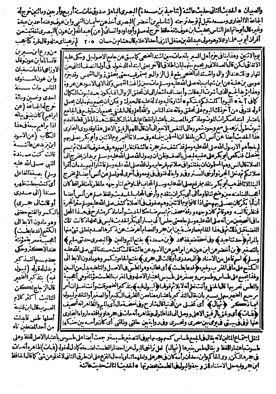 (حَدَّثَنَا حُمَيْدٌ) وَفِي نُسْخَةٍ ضَعِيفَةٍ مُحَمَّدُ بْنُ مَسْعَدَةَ بِفَتْحِ الْمِيمِ وَالْعَيْنِ الْبَصْرِيُّ (حَدَّثَنِي سُلَيْمٌ) بِالتَّصْغِيرِ (ابْنُ أَخْضَرَ عَنِ ابْنِ عَوْنٍ عَنْ إِبْرَاهِيمَ عَنِ الْأَسْوَدِ عَنْ عَائِشَةَ قَالَتْ: كُنْتُ مُسْنِدَةً النَّبِيَّ - صَلَّى اللَّهُ عَلَيْهِ وَسَلَّمَ -) اسْمُ فَاعِلٍ مِنَ الْإِسْنَادِ (إِلَى صَدْرِي أَوْ قَالَتْ: إِلَى حِجْرِي) بِفَتْحِ الْحَاءِ وَبِكَسْرٍ، وَهُوَ مَا دُونَ الْإِبِطِ إِلَى الْكَشْحِ عَلَى مَا فِي الْمُغْرِبِ وَغَيْرِهِ (فَدَعَا بِطَسْتٍ) أَيْ: فَطَلَبَهُ، وَهُوَ الطَّسُّ فِي الْأَصْلِ وَالتَّاءُ فِيهِ بَدَلُ السِّينِ، وَلِهَذَا يُجْمَعُ عَلَى طِسَاسٍ وَطُسُوسٍ وَيُصَغَّرُ عَلَى طُسَيْسٍ اعْتِبَارًا لِأَصْلِهِ، وَفِي الْمُغْرِبِ: الطَّسْتُ مُؤَنَّثَةٌ، وَهِيَ أَعْجَمِيَّةٌ وَالطَّسُّ تَعْرِيبُهَا، وَقَالَ الْحَنَفِيُّ: وَأَنْتَ تَعْلَمُ أَنَّهُ لَا يُلَائِمُ قَوْلَهَا (لِيَبُولَ فِيهِ) بِتَذْكِيرِ الضَّمِيرِ قُلْتُ: وَأَنْتَ تَعْلَمُ أَنَّ أَمْرَ مَرْجِعِ الضَّمِيرِ سَهْلٌ يَسِيرٌ بِأَنْ يُقَالَ التَّذْكِيرُ بِاعْتِبَارِ مَعْنَاهُ مِنَ الظَّرْفِ الْكَبِيرِ أَوِ الصَّغِيرِ، أَوِ التَّقْدِيرُ لِيَبُولَ فِيمَا ذَكَرَ (ثُمَّ بَالَ) أَيْ: تَخَلَّى مِنَ الدُّنْيَا قَالَ شَارِحٌ: وَفِي نُسْخَةٍ مَالَ أَيْ: بِالْمِيمِ، وَالظَّاهِرُ أَنَّهُ تَصْحِيفٌ (فَمَاتَ) أَيْ: وَلَحِقَ بِالرَّفِيقِ الْأَعْلَى وَوَصَلَ إِلَى لِقَاءِ الْمَوْلَى، وَظَاهِرُهُ أَنَّهُ مَاتَ فِي حِجْرِهَا وَيُوَافِقُهُ رِوَايَةُ الْبُخَارِيِّ عَنْهَا تُوُفِّيَ فِي بَيْتِي فِي يَوْمِي بَيْنَ سَحْرِي وَنَحْرِي، وَفِي رِوَايَةٍ بَيْنَ حَاقِنَتِي وَذَاقِنتِي أَيْ: كَانَ رَأْسُهُ بَيْنَ