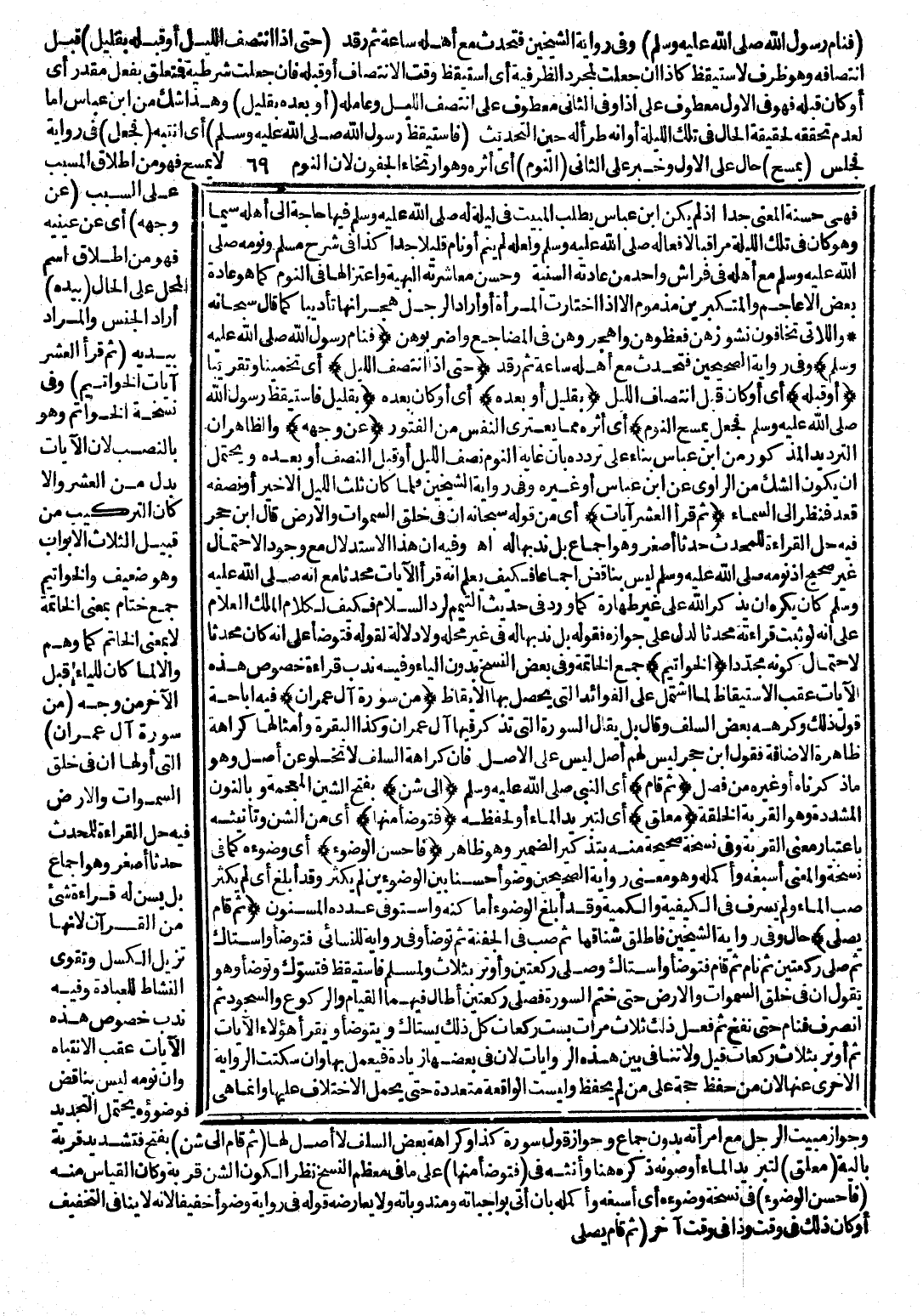 أَوْ بَعْدَهُ) أَيْ أَوْ كَانَ بَعْدَهُ (بِقَلِيلٍ فَاسْتَيْقَظَ رَسُولُ - صَلَّى اللَّهُ عَلَيْهِ وَسَلَّمَ - فَجَعَلَ يَمْسَحُ النَّوْمَ) أَيْ: أَثَرَهُ مِمَّا يَعْتَرِي النَّفْسَ مِنَ الْفُتُورِ (عَنْ وَجْهِهِ) وَالظَّاهِرُ أَنَّ التَّرْدِيدَ الْمَذْكُورَ مِنَ ابْنِ عَبَّاسٍ بِنَاءً عَلَى تَرَدُّدِهِ بِأَنَّ غَايَةَ النَّوْمِ نِصْفُ اللَّيْلِ أَوْ قَبْلَ النِّصْفِ أَوْ بَعْدَهُ، وَيُحْتَمَلُ أَنْ يَكُونَ الشَّكُ مِنَ الرَّاوِي عَنِ ابْنِ عَبَّاسٍ أَوْ لِغَيْرِهِ، وَفِي رِوَايَةِ الشَّيْخَيْنِ: فَلَمَّا كَانَ ثُلُثُ اللَّيْلِ الْأَخِيرِ أَوْ نِصْفُهُ قَعَدَ فَنَظَرَ إِلَى السَّمَاءِ (ثُمَّ قَرَأَ الْعَشْرَ الْآيَاتِ) أَيْ: مِنْ قَوْلِهِ سُبْحَانَهُ إِنَّ فِي خَلْقِ السَّمَاوَاتِ وَالْأَرْضِ قَالَ ابْنُ حَجَرٍ: فِيهِ حِلُّ الْقِرَاءَةِ لِلْمُحْدِثِينَ حَدَثًا أَصْغَرَ، وَهَذَا إِجْمَاعٌ بَلْ نَدَبَهَا لَهُ انْتَهَى. وَفِيهِ أَنَّ هَذَا الِاسْتِدْلَالَ مَعَ وُجُودِ الِاحْتِمَالِ غَيْرُ صَحِيحٍ، إِذْ نَوْمُهُ - صَلَّى اللَّهُ عَلَيْهِ وَسَلَّمَ - لَيْسَ بِنَاقِضٍ إِجْمَاعًا فَكَيْفَ يُعْلَمُ أَنَّهُ قَرَأَ الْآيَاتِ مُحْدِثًا مَعَ أَنَّهُ - صَلَّى اللَّهُ عَلَيْهِ وَسَلَّمَ - كَانَ يَكْرَهُ أَنْ يَذْكُرَ اللَّهَ عَلَى غَيْرِ طَهَارَةٍ كَمَا وَرَدَ فِي حَدِيثِ التَّيَمُّمِ لِرَدِّ السَّلَامِ فَكَيْفَ لِكَلَامِ الْمَلِكَ الْعَلَّامِ عَلَى أَنَّهُ لَوْ ثَبَتَ قِرَاءَتُهُ مُحْدِثًا لَدَلَّ عَلَى جَوَازِهِ، فَقَوْلُهُ بَلْ نَدَبَهَا لَهُ فِي غَيْرِ مَحِلِّهِ، وَلَا دَلَالَةَ لِقَوْلِهِ: «فَتَوَضَّأَ» عَلَى أَنَّهُ كَانَ مُحْدِثًا لِاحْتِمَالِ كَوْنِهِ مُجَرَّدًا (الْخَوَاتِيمَ) جَمْعُ الْخَاتِمَةِ، وَفِي بَعْضِ النُّسَخِ بِدُونِ الْيَاءِ، وَفِيهِ نَدْبُ قِرَاءَةِ خُصُوصِ هَذِهِ الْآيَاتِ عَقِبَ الِاسْتِيقَاظِ لِمَا اشْتَمَلَ عَلَى الْفَوَائِدِ الَّتِي يَحْصُلُ بِهَا الْإِيقَاظُ (مِنْ سُورَةِ آلِ عِمْرَانَ) فِيهِ إِبَاحَةُ قَوْلِ ذَلِكَ، وَكَرِهَهُ بَعْضُ السَّلَفِ، وَقَالَ: بَلْ يُقَالُ السُّورَةُ الَّتِي تُذْكَرُ فِيهَا آلُ عِمْرَانَ وَكَذَا الْبَقَرَةُ وَأَمْثَالُهَا كَرَاهَةَ ظَاهِرِ الْإِضَافَةِ، فَقَوْلُ ابْنِ حَجَرٍ: لَيْسَ لَهُمْ أَصْلٌ. لَيْسَ عَلَى الْأَصْلِ، فَإِنَّ كَرَاهَةَ السَّلَفِ لَا تَخْلُو عَنْ أَصْلٍ، وَهُوَ مَا ذَكَرْنَاهُ أَوْ غَيْرُهُ مِنْ فَصْلٍ (ثُمَّ قَامَ) أَيِ: النَّبِيُّ - صَلَّى اللَّهُ عَلَيْهِ وَسَلَّمَ - (إِلَى شَنٍّ) بِفَتْحِ الشِّينِ الْمُعْجَمَةِ، وَبِالنُّونِ الْمُشَدَّدَةِ، وَهُوَ الْقِرْبَةُ الْخَلِقَةُ (مُعَلَّقٌ) أَيْ: لِتَبْرِيدِ الْمَاءِ أَوْ لِحِفْظِهِ (فَتَوَضَّأَ مِنْهَا) أَيْ: مِنَ الشَّنِّ وَتَأْنِيثُهُ بِاعْتِبَارِ مَعْنَى الْقِرْبَةِ، وَفِي نُسْخَةٍ صَحِيحَةٍ مِنْهُ بِتَذْكِيرِ الضَّمِيرِ وَهُوَ ظَاهِرٌ (فَأَحْسَنَ الْوُضُوءَ) أَيْ: وُضُوءَهُ كَمَا فِي نُسْخَةٍ وَالْمَعْنَى أَسْبَغَهُ وَأَكْمَلَهُ، وَهُوَ مَعْنَى رِوَايَةِ الصَّحِيحَيْنِ وُضُوءًا حَسَنًا بَيْنَ الْوُضُوأَيْنِ لَمْ يُكْثِرْ، وَقَدْ أَبْلَغَ أَيْ: لَمْ يُكْثِرْ صَبَّ الْمَاءِ، وَلَمْ يُسْرِفْ فِي الْكَيْفِيَّةِ أَوِ الْكَمِّيَّةِ، وَقَدْ أَبْلَغَ الْوُضُوءَ أَمَاكِنَهُ، وَاسْتَوْفَى عَدَدَهُ الْمَسْنُونَ (ثُمَّ قَامَ يُصَلِّي) حَالٌ وَفِي رِوَايَةِ الشَّيْخَيْنِ: فَأَطْلَقَ شِنَاقَهَا ثُمَّ صَبَّ فِي الْجَفْنَةِ ثُمَّ تَوَضَّأَ. وَفِي رِوَايَةٍ لِلنَّسَائِيِّ: فَتَوَضَّأَ وَاسْتَاكَ، ثُمَّ صَلَّى رَكْعَتَيْنِ، ثُمَّ نَامَ، ثُمَّ قَامَ فَتَوَضَّأَ وَاسْتَاكَ، وَصَلَّى رَكْعَتَيْنِ، وَأَوْتَرَ بِثَلَاثٍ. وَلِمُسْلِمٍ: فَاسْتَيْقَظَ، فَتَسَوَّكَ وَت