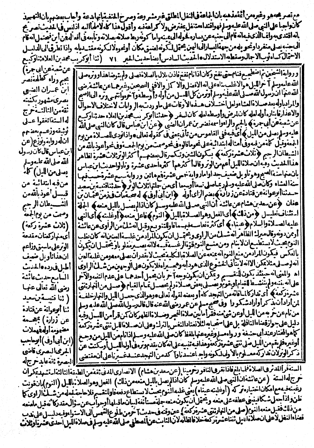(حَدَّثَنَا أَبُو كُرَيْبٍ مُحَمَّدُ بْنُ الْعَلَاءِ، حَدَّثَنَا وَكِيعٌ، عَنْ شُعْبَةَ، عَنْ أَبِي جَمْرَةَ) بِالْجِيمِ وَالرَّاءِ، وَاسْمُهُ نَضْرُ بْنُ عِمْرَانَ الضَّبِّيُّ (عَنِ ابْنِ عَبَّاسٍ قَالَ: كَانَ النَّبِيُّ - صَلَّى اللَّهُ عَلَيْهِ وَسَلَّمَ - يُصَلِّي مِنَ اللَّيْلِ) أَيْ: فِيهِ فَفِي الْقَامُوسِ (مِنْ) تَأَتِي بِمَعْنَى (فِي) كَقَوْلِهِ تَعَالَى: إِذَا نُودِيَ لِلصَّلَاةِ مِنْ يَوْمِ الْجُمُعَةِ وَقِيلَ كَلِمَةُ «مِنْ» فِيهِ وَفِي أَمْثَالِهِ ابْتِدَائِيَّةٌ عَلَى نَحْوِ مَا قَالُوهُ فِي نَحْوِ صُمْتُ مِنْ يَوْمِ الْجُمُعَةِ، وَفِي نَحْوِ أَعُوذُ بِاللَّهِ مِنَ الشَّيْطَانِ الرَّجِيمِ (ثَلَاثَ عَشْرَةَ رَكْعَةً) بِسُكُونِ الشِّينِ، وَيُكْسَرُ قَالَ بَعْضُهُمْ: أَكْثَرُ الْوَتْرِ ثَلَاثَ عَشْرَةَ لِظَاهِرِ هَذَا الْحَدِيثِ، وَفِيهِ أَنَّ صَلَاةَ اللَّيْلِ أَعَمُّ مِنَ الْوَتْرِ، وَقَالَ أَكْثَرُهُمْ: أَكْثَرُهُ إِحْدَى عَشْرَةَ، وَتَأَوَّلُوا حَدِيثَ ابْنِ عَبَّاسٍ بِأَنَّ مِنْهَا سُنَّةَ الصُّبْحِ، وَهُوَ تَأْوِيلٌ ضَعِيفٌ جِدًّا، وَأَمَّا رِوَايَةُ خَمْسَ عَشْرَةَ فَمَعَ هَاتَيْنِ، وَرِوَايَةُ سَبْعَ عَشْرَةَ حُوسِبَ فِيهَا سُنَّةُ الْعِشَاءِ وَكَانَ - صَلَّى اللَّهُ عَلَيْهِ وَسَلَّمَ - رُبَّمَا صَلَّى تِسْعًا أَوْ سَبْعًا أَيْ: مِنْ جُمْلَتِهَا ثَلَاثُ الْوَتْرِ.
