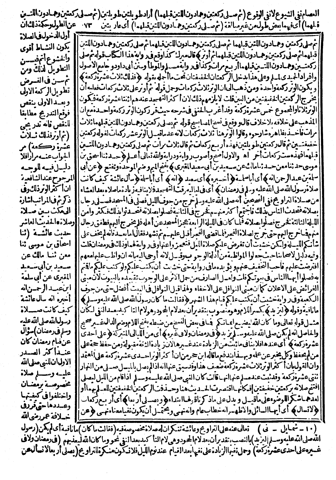 (حَدَّثَنَا إِسْحَاقُ بْنُ مُوسَى، حَدَّثَنَاهُ مَعْنٌ، حَدَّثَنَا مَالِكٌ، عَنْ سَعِيدِ بْنِ أَبِي سَعِيدٍ الْمَقْبُرِيِّ) بِفَتْحِ الْمِيمِ وَضَمِّ الْمُوَحَّدَةِ، وَيُفْتَحُ (عَنْ أَبِي سَلَمَةَ بْنِ عَبْدِ الرَّحْمَنِ أَنَّهُ) أَيْ: أَبَا سَلَمَةَ (أَخْبَرَهُ) أَيْ: سَعِيدًا (أَنَّهُ) أَيْ: أَبَا سَلَمَةَ (سَأَلَ عَائِشَةَ كَيْفَ كَانَتْ صَلَاةُ رَسُولِ اللَّهِ - صَلَّى اللَّهُ عَلَيْهِ وَسَلَّمَ - فِي رَمَضَانَ؟) أَيْ: فِي لَيَالِيهِ وَقْتَ التَّهَجُّدِ، فَلَا يُنَافِيهِ زِيَادَةُ مَا صَلَّاهُ بَعْدَ الْعِشَاءِ مِنْ صَلَاةِ التَّرَاوِيحِ، فَفِي الصَّحِيحَيْنِ أَنَّهُ - صَلَّى اللَّهُ عَلَيْهِ وَسَلَّمَ -: «خَرَجَ مِنْ جَوْفِ اللَّيْلِ، فَصَلَّى فِي الْمَسْجِدِ فَصَلَّى رِجَالٌ بِصَلَاتِهِ، فَتَحَدَّثَ النَّاسُ بِذَلِكَ، فَاجْتَمَعَ أَكْثَرُ مِنْهُمْ فَخَرَجَ فِي الثَّانِيَةِ فَصَلَّوْا بِصَلَاتِهِ، فَتَحَدَّثُوا بِذَلِكَ فَكَثُرُوا مِنَ اللَّيْلَةِ الثَّالِثَةِ، فَخَرَجَ فَصَلَّوْا بِصَلَاتِهِ، فَلَمَّا كَانَ فِي اللَّيْلَةِ الرَّابِعَةِ عَجَزَ الْمَسْجِدُ عَنْ أَهْلِهِ، فَلَمْ يَخْرُجْ إِلَيْهِمْ فَطَفِقَ رِجَالٌ مِنْهُمْ، فَمَا خَرَجَ إِلَيْهِمْ حَتَّى خَرَجَ لِصَلَاةِ الْفَجْرِ، فَلَمَّا قَضَى الْفَجْرَ أَقْبَلَ عَلَيْهِمْ ثُمَّ تَشَهَّدَ فَقَالَ: أَمَّا بَعْدُ، فَإِنَّهُ لَمْ يَخْفَ عَلَيَّ شَأْنُكُمُ اللَّيْلَةَ، وَلَكِنْ خَشِيتُ أَنْ يُفْرَضَ عَلَيْكُمْ صَلَاةُ اللَّيْلِ فَتَعْجَزُوا عَنْهَا» ، وَفِي رِوَايَةٍ لَهُمَا: وَذَلِكَ فِي رَمَضَانَ، قُلْتُ: وَفِيهِ دَلِيلٌ لِأَصْحَابِنَا حَيْثُ جَعَلُوا الْمُوَاظَبَةَ مِنْ أَدِلَّةِ الْوُجُوبِ، وَقِيلَ ; لِأَنَّهُ أُوحِيَ إِلَيْهِ بِأَنَّهُ لَوْ وَاظَبَ عَلَيْهَا مَعَهُمُ افْتُرِضَتْ عَلَيْهِمْ فَأَحَبَّ التَّخْفِيفَ عَنْهُمْ وَيُؤَيِّدُهُ مَا فِي رِوَايَةِ: «حَتَّى خَشِيتُ أَنْ يُكْتَبَ عَلَيْكُمْ، وَلَوْ كُتِبَ عَلَيْكُمْ مَا قُمْتُمْ بِهِ فَصَلُّوا أَيُّهَا النَّاسُ فِي بُيُوتِكُمْ» ، قُلْتُ: وَلَعَلَّ الصَّارِفَ مِنْ حَمْلِ الْأَثَرِ عَلَى الْوُجُوبِ تَقْيِيدُهُ بِالْبُيُوتِ ; لِأَنَّ مَبْنَى الْفَرَائِضِ عَلَى الْإِعْلَانِ كَمَا أَنَّ مَبْنَى النَّوَافِلِ عَلَى الْإِخْفَاءِ، وَلِهَذَا قِيلَ النَّوَافِلُ فِي الْبَيْتِ أَفْضَلُ حَتَّى مِنْ جَوْفِ الْكَعْبَةِ، وَفِي رِوَايَةٍ: «خَشِيتُ أَنْ يُكْتَبَ عَلَيْكُمْ قِيَامُ هَذَا الشَّهْرِ» (فَقَالَتْ: مَا كَانَ رَسُولُ اللَّهِ - صَلَّى اللَّهُ عَلَيْهِ وَسَلَّمَ -) مَا نَافِيةٌ وَقَوْلُهُ (لِيَزِيدَ) بِكَسْرِ اللَّامِ، وَهُوَ مَنْصُوبٌ بِتَقْدِيرِ أَنْ بَعْدَ لَامِ الْجُحُودِ، وَهُوَ لَامُ التَّأْكِيدِ بَعْدَ النَّفْيِ لَكَانَ مِثْلَ قَوْلِهِ تَعَالَى، وَمَا كَانَ اللَّهُ لِيُضِيعَ إِيمَانَكُمْ فَمَا فِي بَعْضِ النُّسَخِ مِنْ ضَبْطِهِ بِفَتْحِ اللَّامِ وَضَمِّ الدَّالِ غَيْرُ صَحِيحٍ، وَالْحَاصِلُ أَنَّهُ لَمْ يَكُنْ - صَلَّى اللَّهُ عَلَيْهِ وَسَلَّمَ - يَزِيدُ (فِي رَمَضَانَ وَلَا فِي غَيْرِهِ) أَيْ: مِنَ اللَّيَالِي الْمُتَبَرَّكَةِ (عَلَى إِحْدَى عَشْرَةَ رَكْعَةً) أَيْ: عِنْدَهَا فَلَا يُنَافِي مَا ثَبَتَ مِنَ الزِّيَادَةِ عِنْدَ غَيْرِهَا ; لِأَنَّ زِيَادَةَ الثِّقَةِ مَقْبُولَةٌ، وَمَنْ حَفِظَ حُجَّةٌ عَلَى مَنْ لَمْ يَحْفَظْ، وَكُلٌّ يُخْبِرُ عَنْ عَمَلِهِ، وَبِهَذَا يَنْدَفِعُ مَا قَالَهُ ابْنُ حَجَرٍ مِنْ أَنَّ أَكْثَرَ