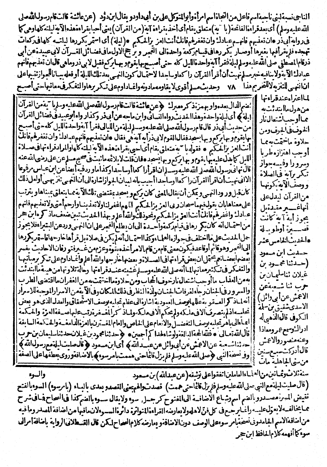 بِهَمْزَةٍ ذَكَرَهُ مِيرَكُ (عَنْ عَائِشَةَ قَالَتْ: قَامَ رَسُولُ اللَّهِ - صَلَّى اللَّهُ عَلَيْهِ وَسَلَّمَ - بِآيَةٍ مِنَ الْقُرْآنِ لَيْلَةً) أَيْ: لَيْلَةً وَاحِدَةً، وَهَذَا الْحَدِيثُ رَوَاهُ النَّسَائِيُّ، وَابْنُ مَاجَهْ عَنْ أَبِي ذَرٍّ، وَكَذَا رَوَاهُ أَبُو عُبَيْدَةَ فِي فَضَائِلِ الْقُرْآنِ مِنْ حَدِيثِ أَبِي ذَرٍّ قَالَ: قَامَ رَسُولُ اللَّهِ - صَلَّى اللَّهُ عَلَيْهِ وَسَلَّمَ - لَيْلَةً مِنَ اللَّيَالِي فَقَرَأَ آيَةً وَاحِدَةً اللَّيْلَ كُلَّهُ حَتَّى أَصْبَحَ بِهَا يَقُومُ، وَبِهَا يَرْكَعُ وَبِهَا يَسْجُدُ، فَقَالَ الْقَوْمُ: لِأَبِي ذَرٍّ أَيَّةَ آيَةٍ هِيَ فَقَالَ إِنْ تُعَذِّبْهُمْ فَإِنَّهُمْ عِبَادُكَ وَإِنْ تَغْفِرْ لَهُمْ فَإِنَّكَ أَنْتَ الْعَزِيزُ الْحَكِيمُ فَقَوْلُهُ بِآيَةٍ مُتَعَلِّقٌ بِقَامَ أَيْ: أَحَيَى بِقِرَاءَةِ هَذِهِ الْآيَةِ لَيْلَتَهُ كُلَّهَا، وَالْمُرَادُ قِرَاءَتُهَا فِي صَلَاةِ اللَّيْلِ كَمَا يَدُلُّ عَلَيْهِ بِهَا يَقُومُ وَبِهَا يَرْكَعُ، وَبِهَا يَسْجُدُ ; فَإِنْ قُلْتَ لَا يُلَائِمُهُ مَا ثَبَتَ فِي صَحِيحِ مُسْلِمٍ عَنْ عَلِيٍّ رَضِيَ اللَّهُ عَنْهُ قَالَ: نَهَانِي رَسُولُ اللَّهِ - صَلَّى اللَّهُ عَلَيْهِ وَسَلَّمَ - أَنْ أَقْرَأَ رَاكِعًا أَوْ سَاجِدًا، وَكَذَا مَا وَرَدَ فِيهِ أَيْضًا عَنِ ابْنِ عَبَّاسٍ مَرْفُوعًا إِلَّا أَنِّي نُهِيتُ أَنْ أَقْرَأَ الْقُرْآنَ رَاكِعًا أَوْ سَاجِدًا أُجِيبَ بِأَنَّهُ لِبَيَانِ الْجَوَازِ إِشَارَةٌ إِلَى أَنَّ النَّهْيَ تَنْزِيهِيٌّ، أَوْ لَعَلَّ ذَلِكَ كَانَ قَبْلَ وُرُودِ النَّهْيِ، وَيُمْكِنُ أَنْ يُقَالَ الْمَعْنَى كَانَ يَرْكَعُ، وَيَسْجُدُ بِمُقْتَضَى تِلْكَ الْآيَةِ مِمَّا يَتَعَلَّقُ بِمَبْنَاهَا، وَيَتَرَتَّبُ عَلَى مَعْنَاهَا بِأَنْ يَقُولَ فِيهِمَا سُبْحَانَ رَبِّيَ الْعَزِيزِ الْحَكِيمِ، اللَّهُمَّ اغْفِرْ لَنَا وَلَا تُعَذِّبْنَا، وَارْحَمْ أُمَّتِي، وَلَا تُعَذِّبْهُمْ فَإِنَّهُمْ عِبَادُكَ، وَاغْفِرْ لَهُمْ ; فَإِنَّكَ أَنْتَ الْعَزِيزُ الْحَكِيمُ، وَنَحْوُ ذَلِكَ وَاللَّهُ أَعْلَمُ. وَبِهَذَا الْحَدِيثِ تَبَيَّنَ ضَعْفُ مَا ذَكَرَهُ ابْنُ حَجَرٍ مِنَ احْتِمَالِ أَنَّهُ كَانَ يُكَرِّرُهَا فِي قِيَامِ رَكْعَةٍ وَاحِدَةٍ إِلَى أَنْ يَطْلُعَ الْفَجْرُ عَلَى أَنَّ النَّهْيَ وَرَدَ عَنِ الْبُتَيْرَاءِ، فَلَا يَجُوزُ حَمْلُ الْحَدِيثِ عَلَى مَا اخْتَلَفَ فِي جَوَازِهِ الْعُلَمَاءُ، وَكَذَا احْتِمَالُ أَنَّهُ لَمْ يَكُنْ فِي صَلَاةٍ بَلْ قَرَأَهَا خَارِجَهَا فَاسْتَمَرَّ يُكَرِّرُهَا إِلَى الْفَجْرِ، وَهُوَ قَائِمٌ أَوْ قَاعِدٌ، فَيَكُونُ مَعْنَى قَامَ مِنْ قَامَ بِالْأَمْرِ أَخَذَهُ بِقُوَّةٍ وَعَزْمٍ مِنْ غَيْرِ فُتُورٍ ; فَإِنَّ الْأَحَادِيثَ يُفَسِّرُ بَعْضُهَا بَعْضًا، نَعَمْ يُحْتَمَلُ أَنَّ بَعْضَ قِرَاءَتِهَا فِي الصَّلَاةِ، وَبَعْضَهَا خَارِجُهَا وَاللَّهُ أَعْلَمُ، وَإِنَّمَا دَاوَمَ عَلَى تَكْرِيرِ مَبَانِيهَا، وَالتَّفْكِيرِ فِي كَثْرَةِ مَعَانِيهَا لِمَا أَنَّهُ - صَلَّى اللَّهُ عَلَيْهِ وَسَلَّمَ - غَشِيَتْهُ عِنْدَ قِرَاءَتِهَا، وَحَالَةِ تِلَاوَتِهَا مِنْ هَيْبَةِ مَا ابْتُدِئَتْ بِهِ مِنَ الْعَذَابِ مَا أَوْجَبَ اشْتِعَالَ نَارِ خَوْفِ الْحِجَابِ، وَمِنْ حَلَاوَةِ مَا اخْتُتِمَتْ بِهِ مِنَ الْغُفْرَانِ مَا اقْتَضَى الطَّرَبَ وَالسُّرُورَ فِي الْجِنَانِ رَجَاءً لِغُرُفَاتِ الْجِنَانِ، وَلَذَّةِ النَّظَرِ فِي ذَلِكَ الْمَكَانِ، وَفِي الْآيَةِ مِنَ الْأَسْرَارِ الْمُوجِبَةِ لِلْإِسْرَارِ أَنَّهُ لَمَّا ذَكَرَ الْعُقُوبَةَ عَلَّلَهَا بِوَصْفِ الْعُبُودِيَّةِ إِشَارَةً إِلَى عِظَمِ تَجَلِّيهِ بِوَصْفِ الِاسْتِحْقَاقِ، وَالْعَدْلِ الَ