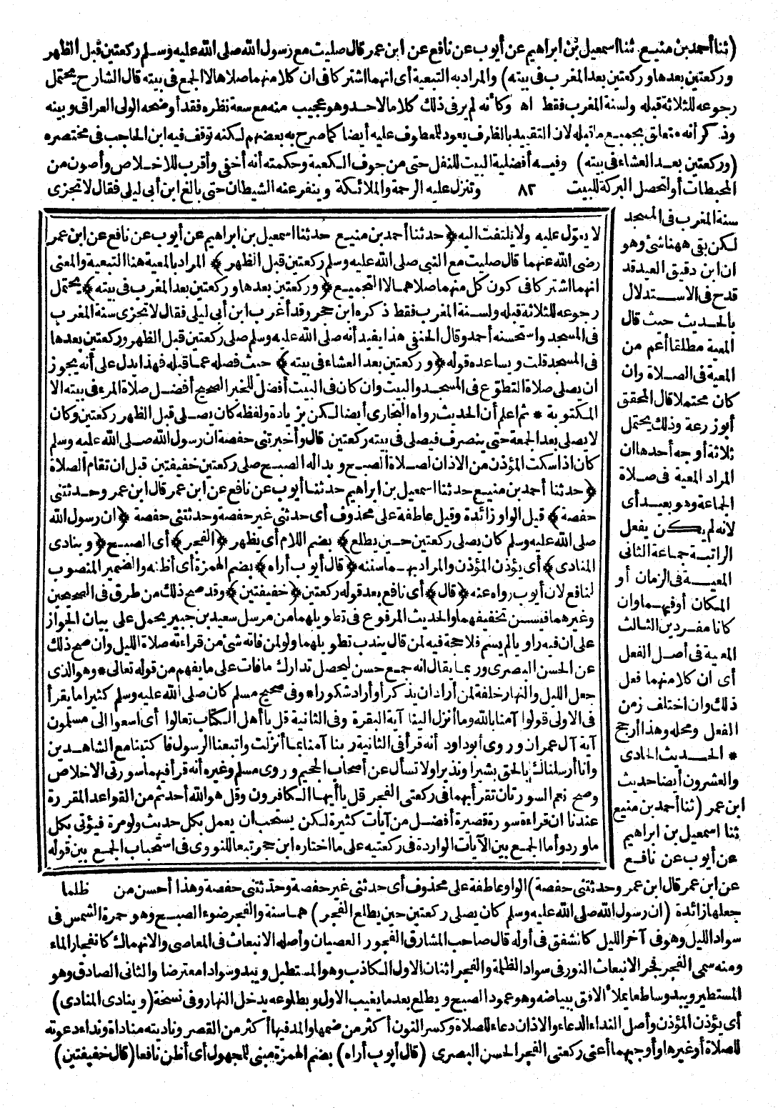 (حَدَّثَنَا أَحْمَدُ بْنُ مَنِيعٍ، حَدَّثَنَا إِسْمَاعِيلُ بْنُ إِبْرَاهِيمَ، عَنْ أَيُّوبَ، عَنْ نَافِعٍ، عَنِ ابْنِ عُمَرَ - رَضِيَ اللَّهُ عَنْهُمَا - قَالَ: صَلَّيْتُ مَعَ النَّبِيِّ - صَلَّى اللَّهُ عَلَيْهِ وَسَلَّمَ - رَكْعَتَيْنِ قَبْلَ الظُّهْرِ) الْمُرَادُ بِالْمَعِيَّةِ هُنَا التَّبَعِيَّةُ، وَالْمَعْنَى أَنَّهُمَا اشْتَرَكَا فِي كَوْنِ كُلٍّ مِنْهُمَا صَلَّاهُمَا لَا التَّجْمِيعُ (وَرَكْعَتَيْنِ بَعْدَهَا، وَرَكْعَتَيْنِ بَعْدَ الْمَغْرِبِ فِي بَيْتِهِ) يُحْتَمَلُ رُجُوعُهُ لِلثَّلَاثَةِ قَبْلَهُ وَلِسُنَّةِ الْمَغْرِبِ فَقَطْ ذَكَرَهُ ابْنُ حَجَرٍ، وَقَدْ أَغْرَبَ ابْنُ أَبِي لَيْلَى، فَقَالَ: لَا تُجْزِئُ سُنَّةُ الْمَغْرِبِ فِي الْمَسْجِدِ، وَاسْتَحْسَنَهُ أَحْمَدُ، وَقَالَ الْحَنَفِيُّ: هَذَا يُفِيدُ أَنَّهُ - صَلَّى اللَّهُ عَلَيْهِ وَسَلَّمَ - صَلَّى رَكْعَتَيْنِ قَبْلَ الظُّهْرِ، وَرَكْعَتَيْنِ بَعْدَهَا فِي الْمَسْجِدِ، قُلْتُ: وَيُسَاعِدُهُ قَوْلُهُ (وَرَكْعَتَيْنِ بَعْدَ الْعِشَاءِ فِي بَيْتِهِ) حَيْثُ فَصَلَهُ عَمَّا قَبْلَهُ، فَهَذَا يَدُلُّ عَلَى أَنَّهُ يَجُوزُ أَنْ
